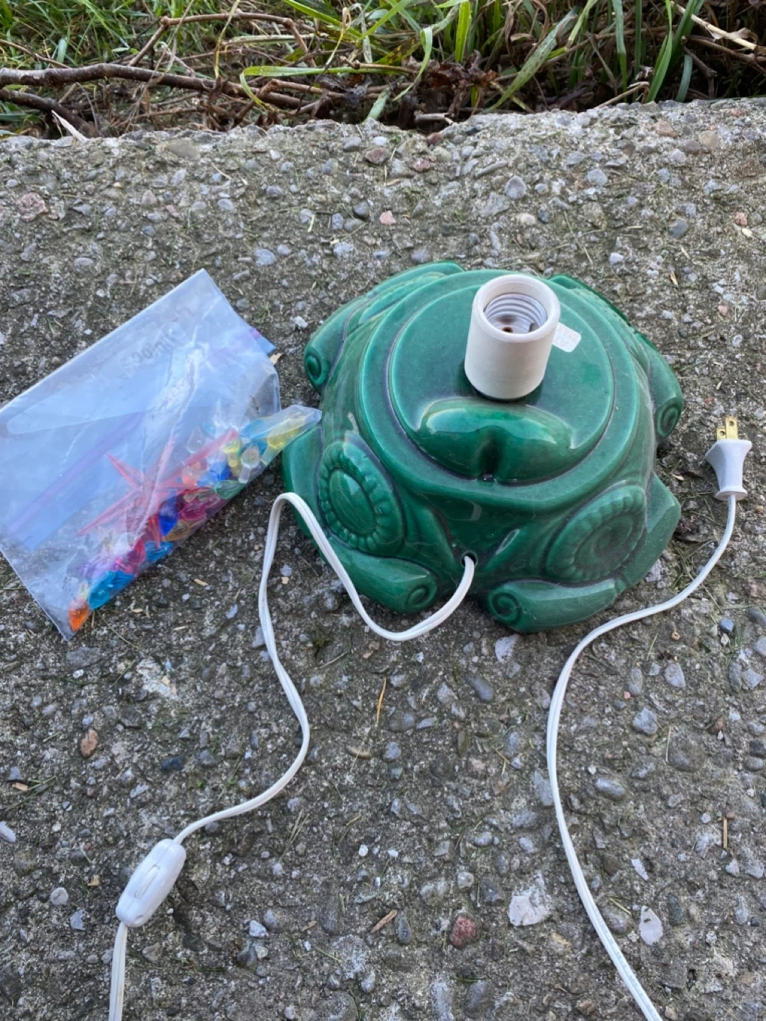 Selling a vintage ceramic Christmas tree base. It has a green glaze and comes with a bag of colourful plastic pegs. The base is marked "OCT 1982", so it's definitely a retro piece!