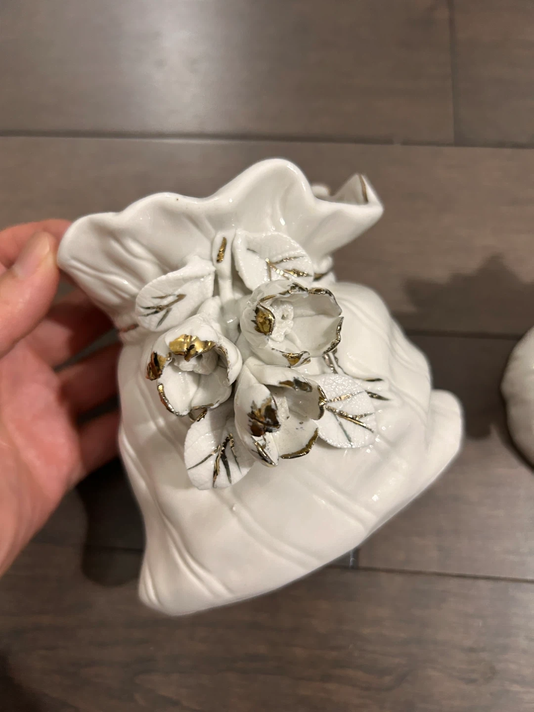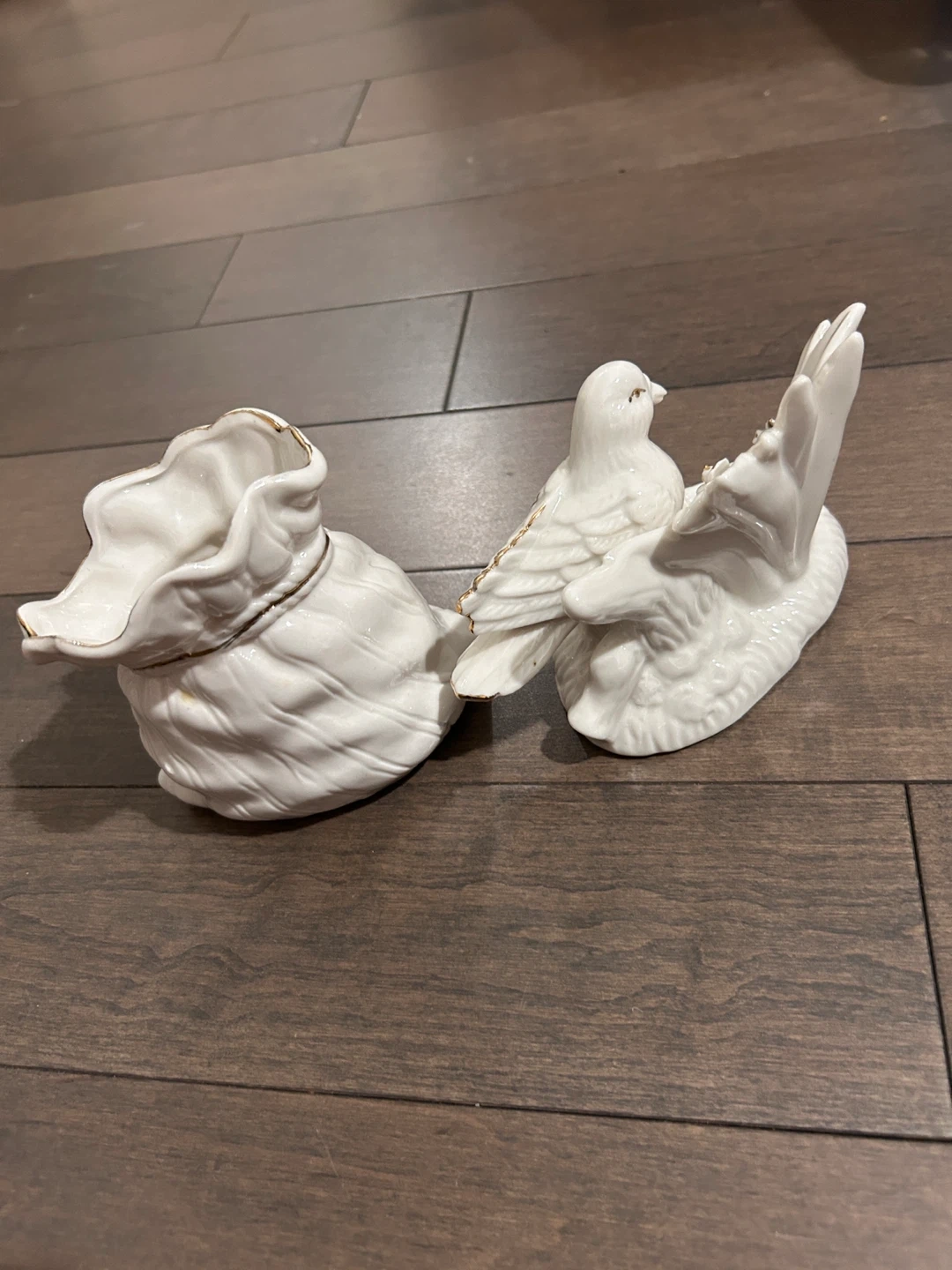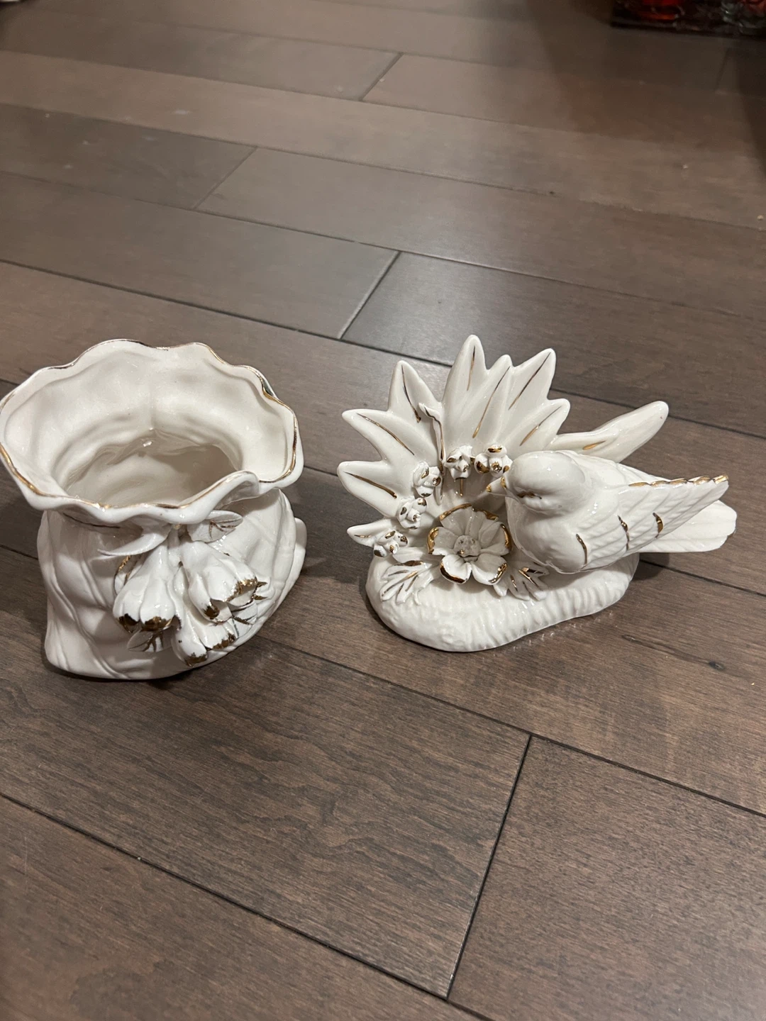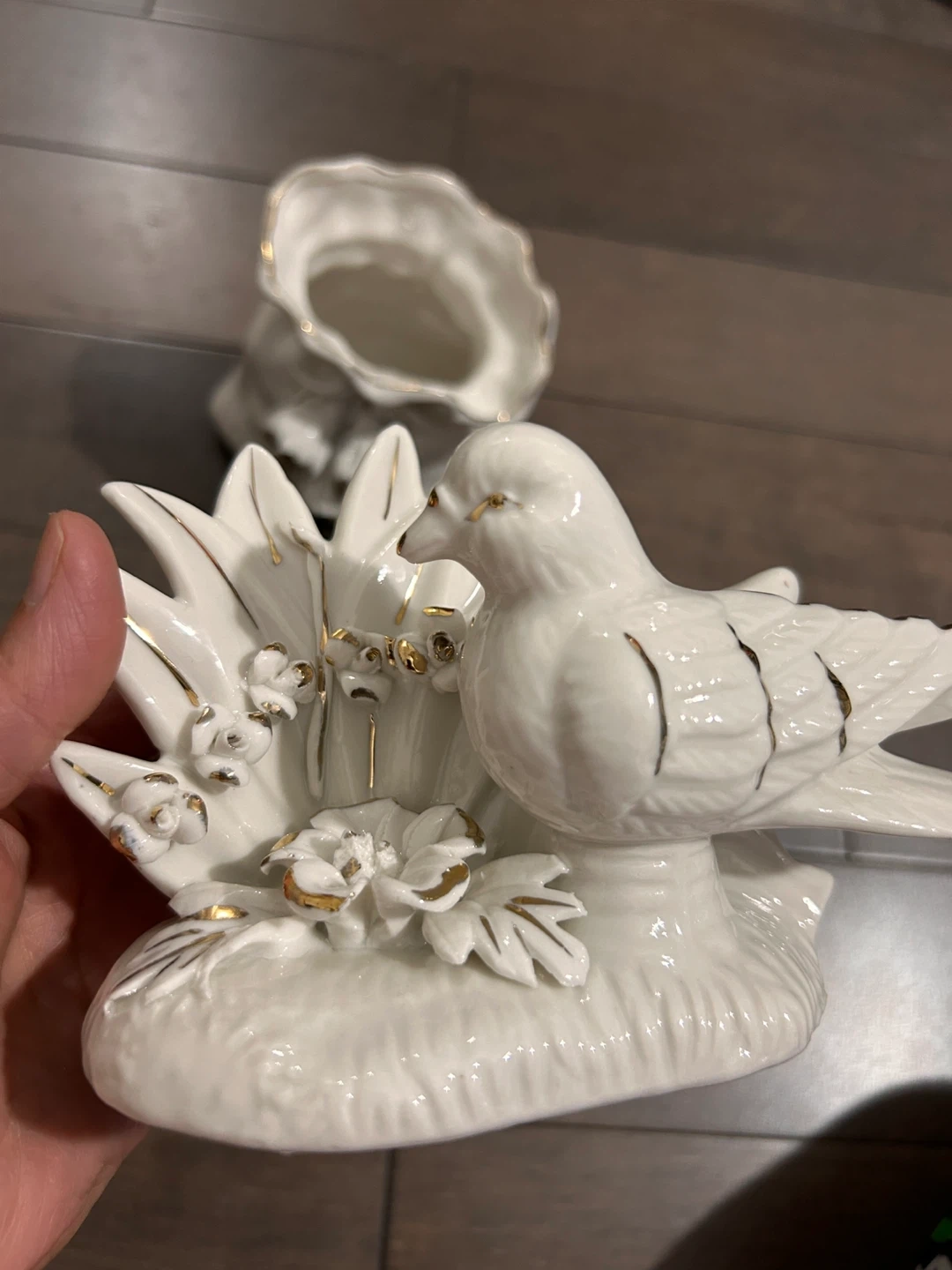 Selling a lovely vintage ceramic set! It includes a dove figurine with a flower and a small vase with floral details. The set is white with gold accents, adding a touch of elegance to any space
