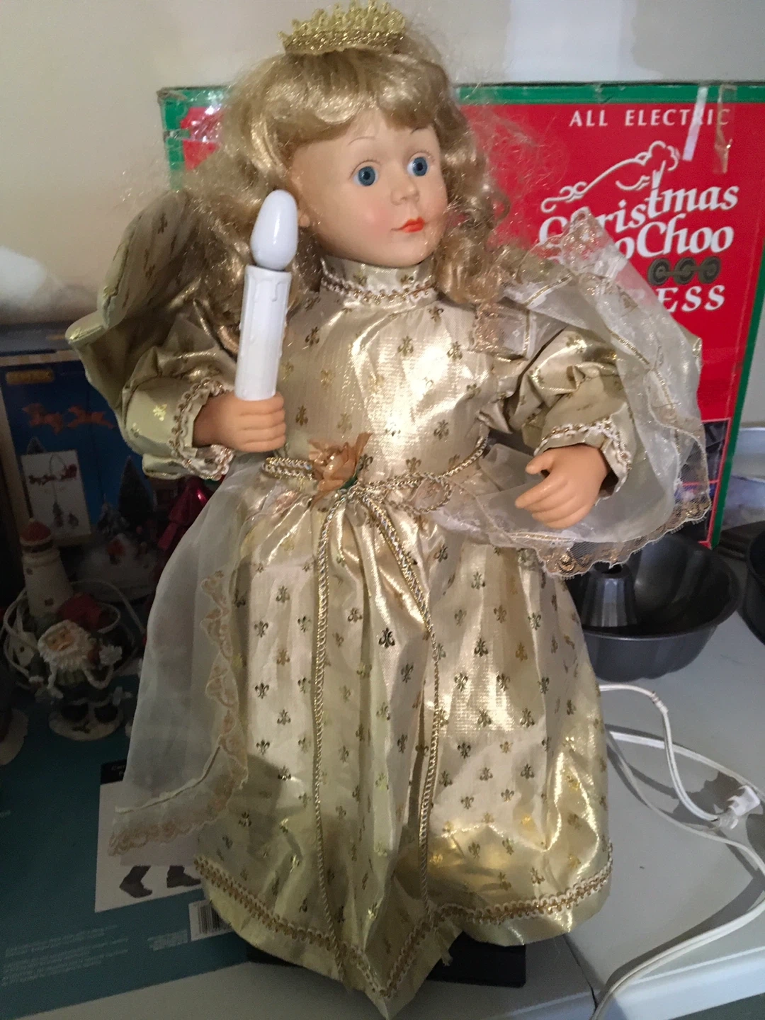 Selling a vintage Christmas angel doll. She's wearing a gold dress and holding a candle. Perfect for holiday decorating!