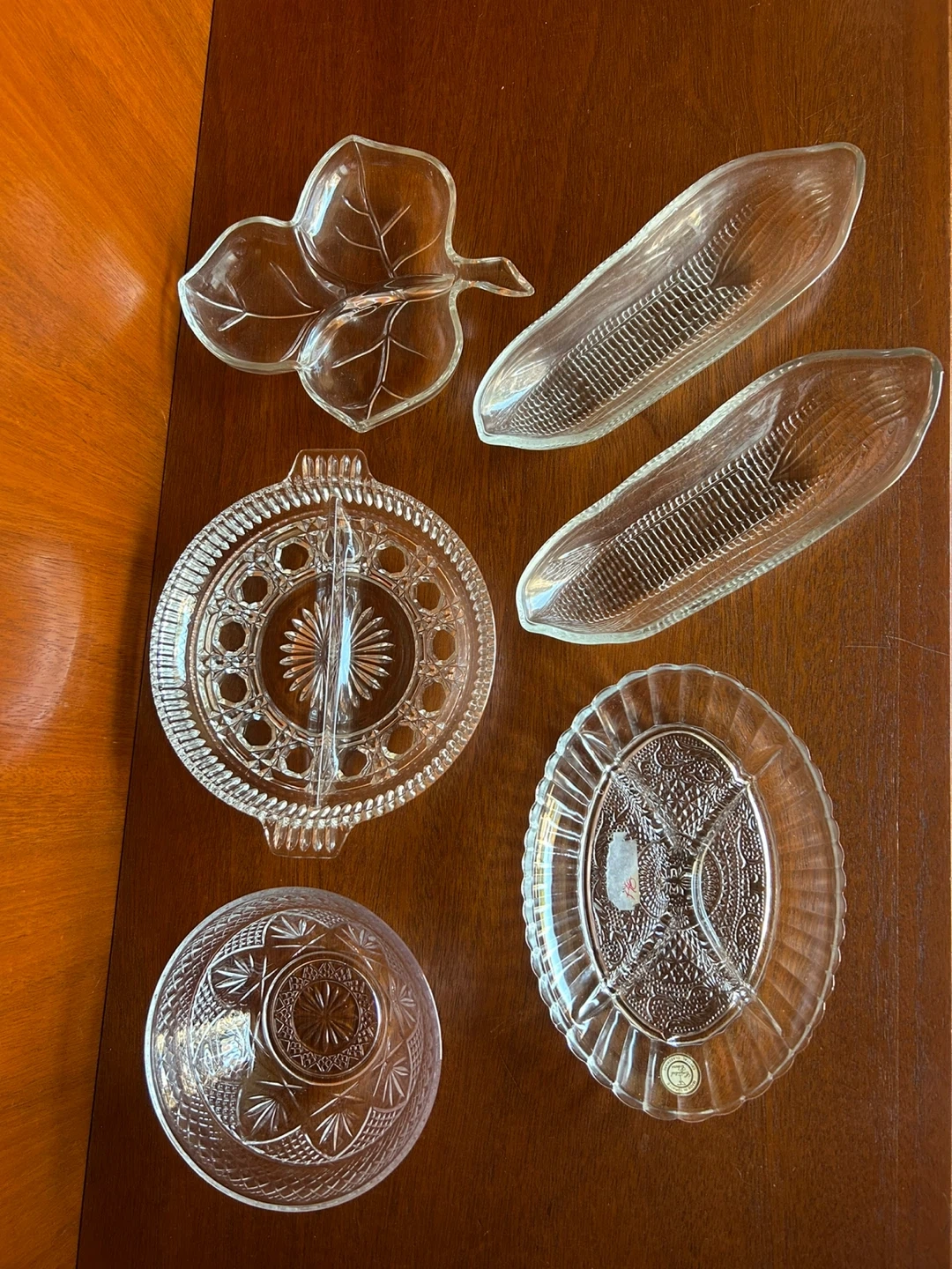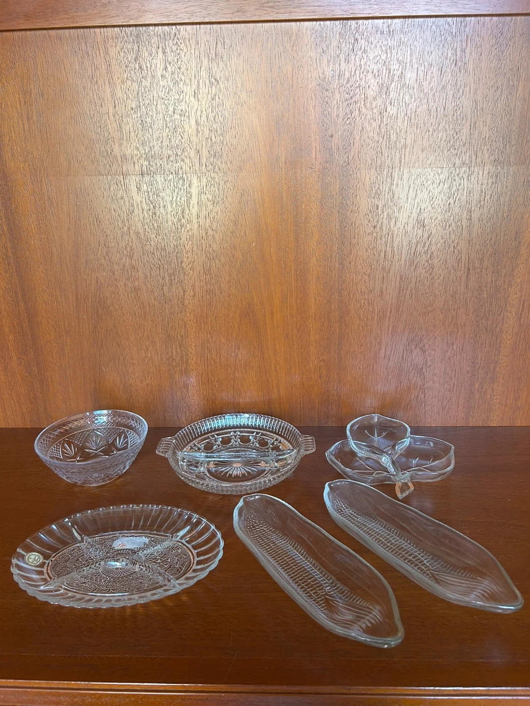 Selling a set of vintage clear glass serving dishes. The set includes a variety of unique shapes and patterns, perfect for adding a touch of retro charm to your table setting. They're in good condition and ready to be used for your next gathering!