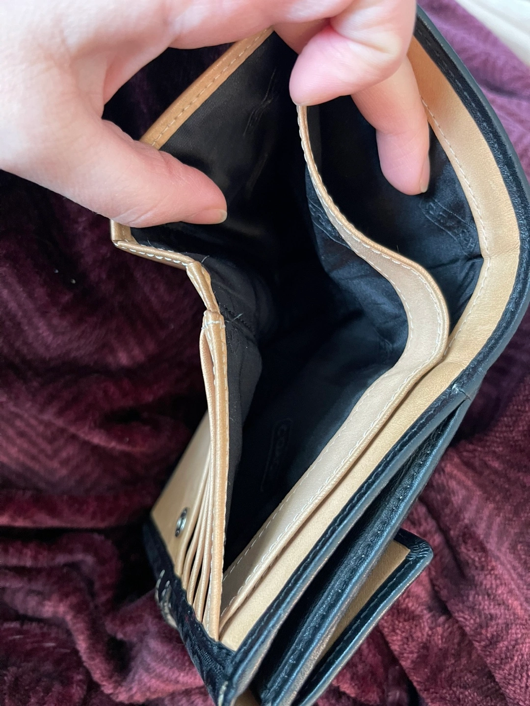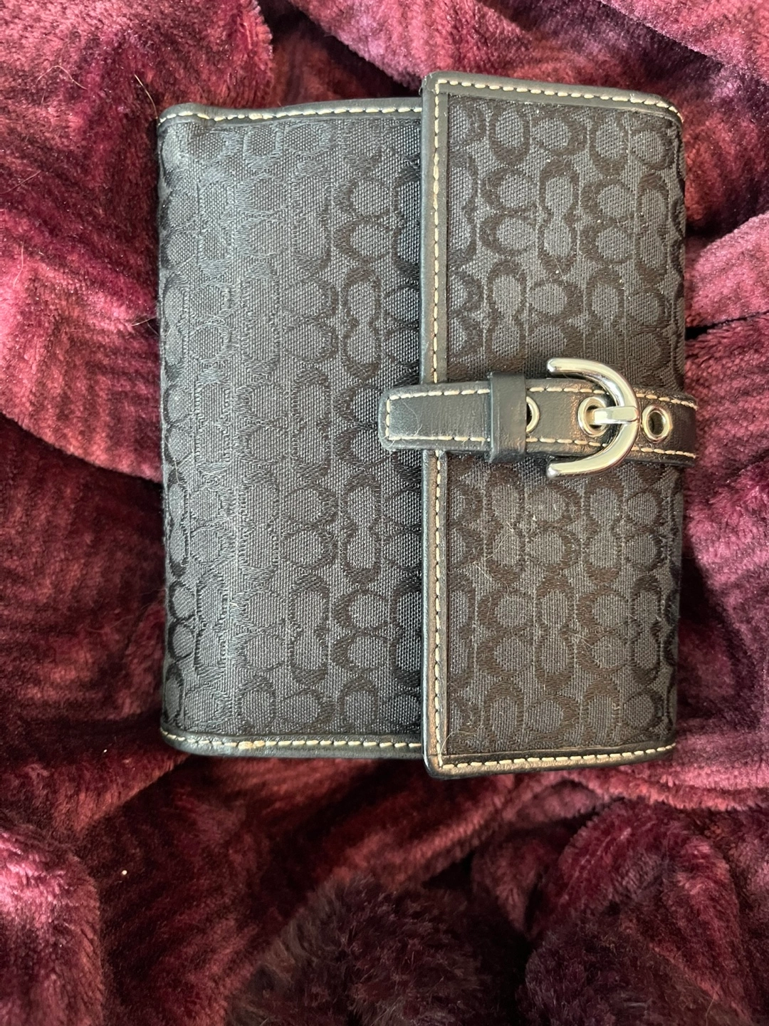 Black Coach wallet. Features a signature C pattern and a buckle closure. Multiple card slots and bill compartments. Pre-owned, shows some wear. Open to offers, bundles, and some trades. Generally free evenings and weekends. Prioritizing fastest pick up. Pick up is in Liberty Village