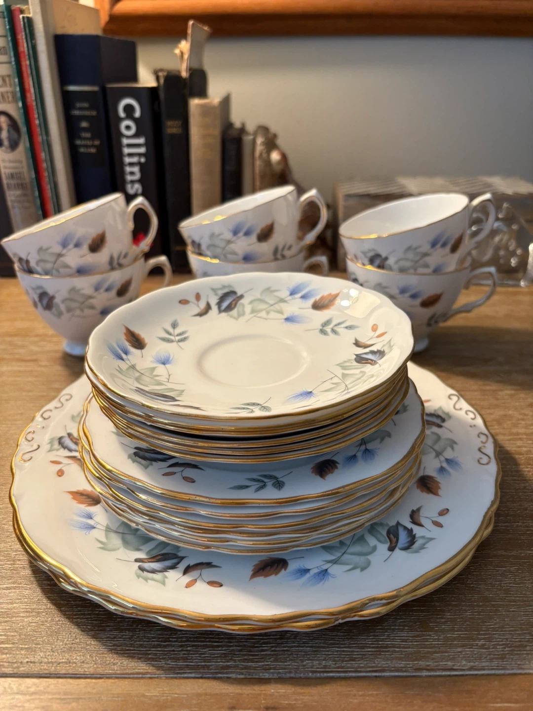Selling a Colclough dessert set ! This set features a delicate leaf design with a gold trim, perfect for adding a touch of elegance to your tea time. The set consists of 2 cake plates, 6 dessert plates and 6 cups and saucers. All are in perfect condition. Niagara Falls North end location for pick up. Cash only