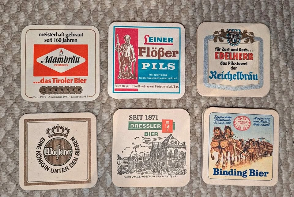 Mostly new condition - priced individually, but discounted for bulk. ⬜ SQUARE: Reichelbräu – Edelherb (das Pils-Juwel) (Kulmbach, Germany) • Classic 1970s/80s style, metallic ink. $3 Binding Bier (Frankfurt am Main, Germany) • Features horse team illustration, c. 1970s–80s. $3 Leiner Flößer Pils (Förtschendorf, Bavaria, Germany) • Exportbierbrauerei motif with historical figure. $5 Dressler Bier – “Seit 1871” (Bremen, Germany) • Market square illustration, traditional style. $3 Adambrau – Innsbruck, Tirol, Austria • Tiroler Bier, with medal awards (Paris 1979, Amsterdam 1981, Lissabon 1985). $5 Warsteiner – “Eine Königin unter den Bieren” (Warstein, Germany) • Iconic Warsteiner crown logo. $3 🔴 CIRCLE: Cölner Hofbräu Früh (Kölsch) – Cologne, Germany • Iconic Kölsch brewery $5 HB München (Hofbräuhaus München) – Munich, Germany • One of the most famous breweries worldwide. $3 Kapsreiter Landbier – Schärding, Austria • Historic brewery (founded 1590, now defunct). $4 Lammbrau-Daur Strullendorf – Bavaria, Germany • Franconian brewery. $3 Bärenbräu Pils – Bavaria, Germany Classic regional pils coaster. $3 Vierzehnheiligen Bier (Alte Klosterbrauerei) – Bavaria, Germany • Monastic brewery $3 Riegeler Bier (Seit 1834) – Baden-Württemberg, Germany • Long history, nice crest design. $3 Maisel’s Pilsner – Bayreuth, Bavaria, Germany • Known for their wheat beers. $5 Maisel’s Dampfbier – Bayreuth, Bavaria, Germany $5 Paulaner Hefe-Weißbier Naturtrüb – Munich, Germany $3 Hacker-Pschorr Weißbier (“Ob blond, ob dunkel…”) – Munich, Germany • Popular Brewery $2 Königsbacher – Koblenz, Germany $2 Rennsteig-Biere (Qualitäts-Biere) – Thüringen, Germany $2 Bitburger Pils – Bitburg, Germany $2
