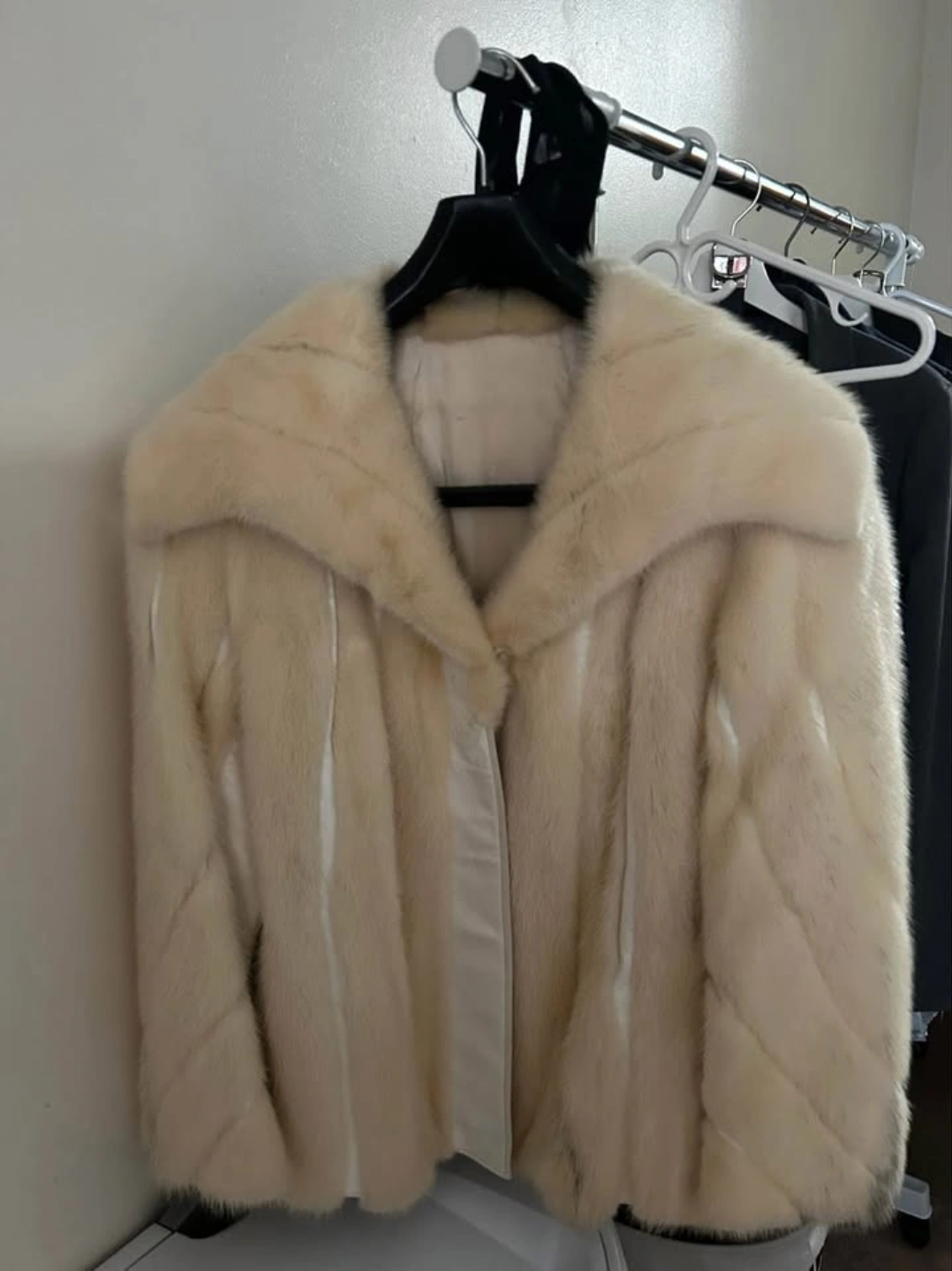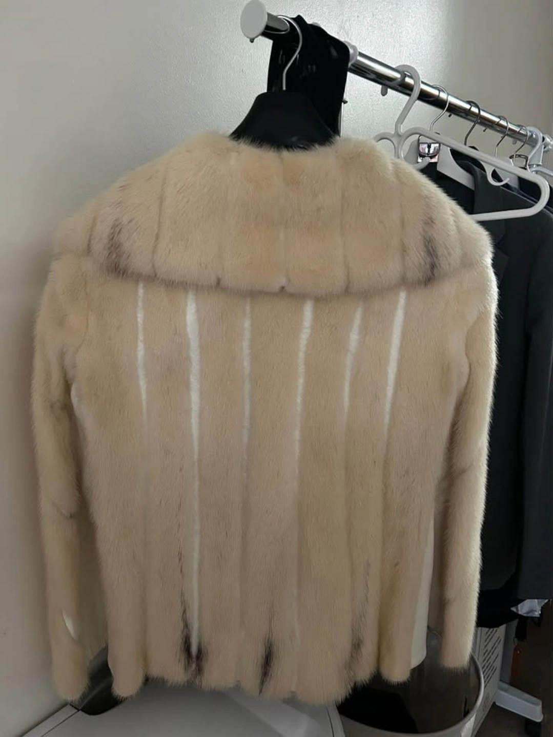 Beautiful vintage cream-coloured mink fur coat! It's in great condition and perfect for adding a touch of elegance to any outfit. The fur is soft and luxurious, and the coat is fully lined with leather for extra warmth and comfort.