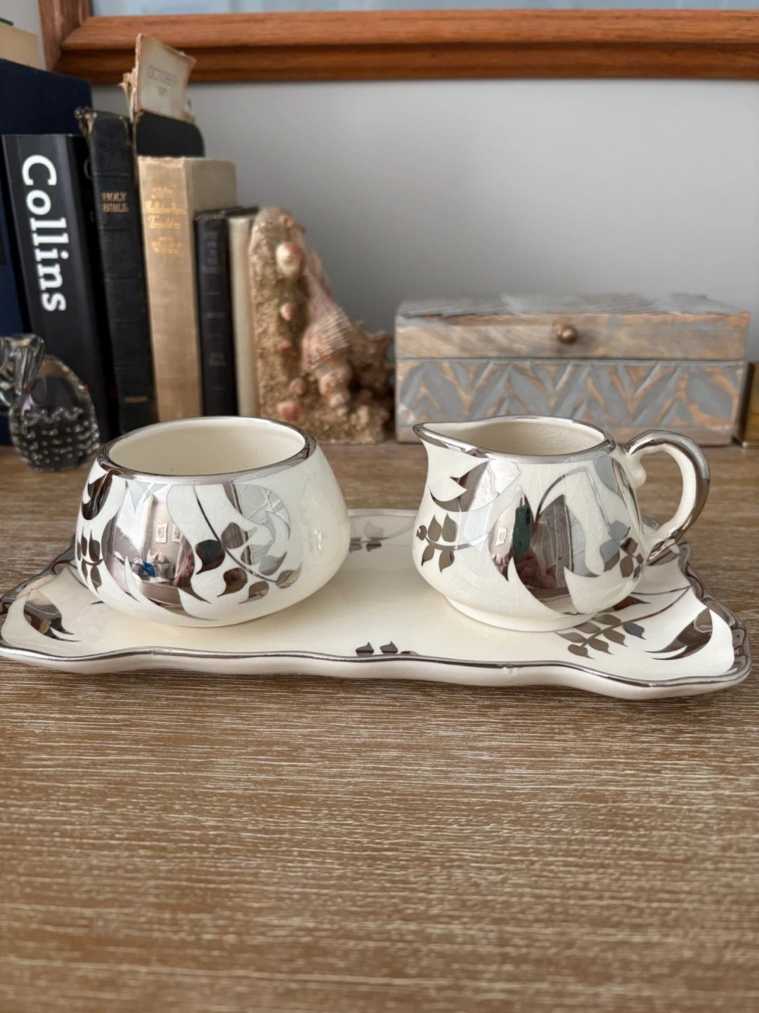 Here's a lovely vintage cream and sugar set, complete with a matching tray! The set features a delicate floral design in silver on a cream background. Perfect for adding a touch of elegance to your tea or coffee service. Niagara Falls North end location pick up. Cash only
