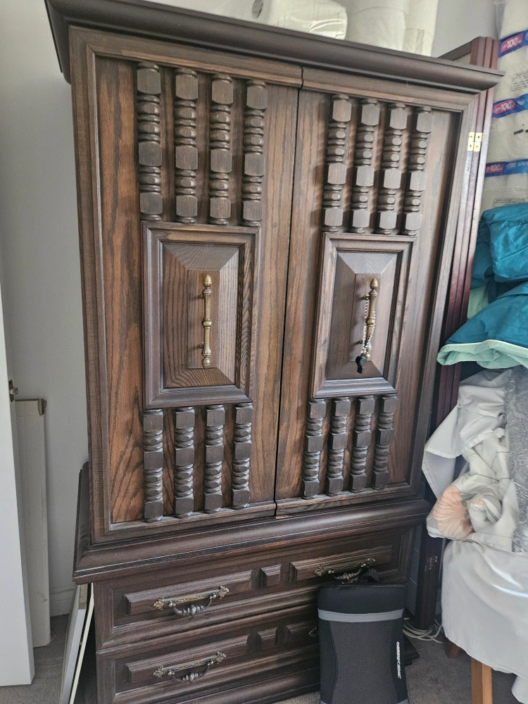 Selling a vintage dark wood armoire! It features a unique design with decorative wood detailing on the doors and drawers. The armoire has a lot of storage space with drawers at the bottom and a cabinet on top. It would be a great addition to any bedroom or living room!