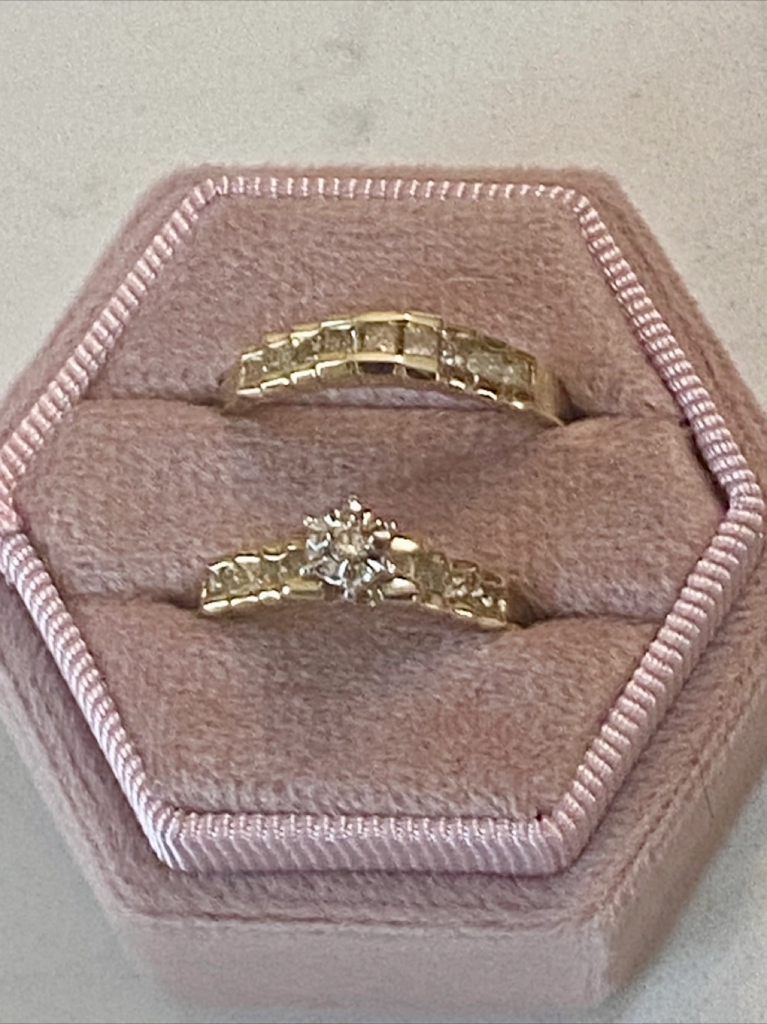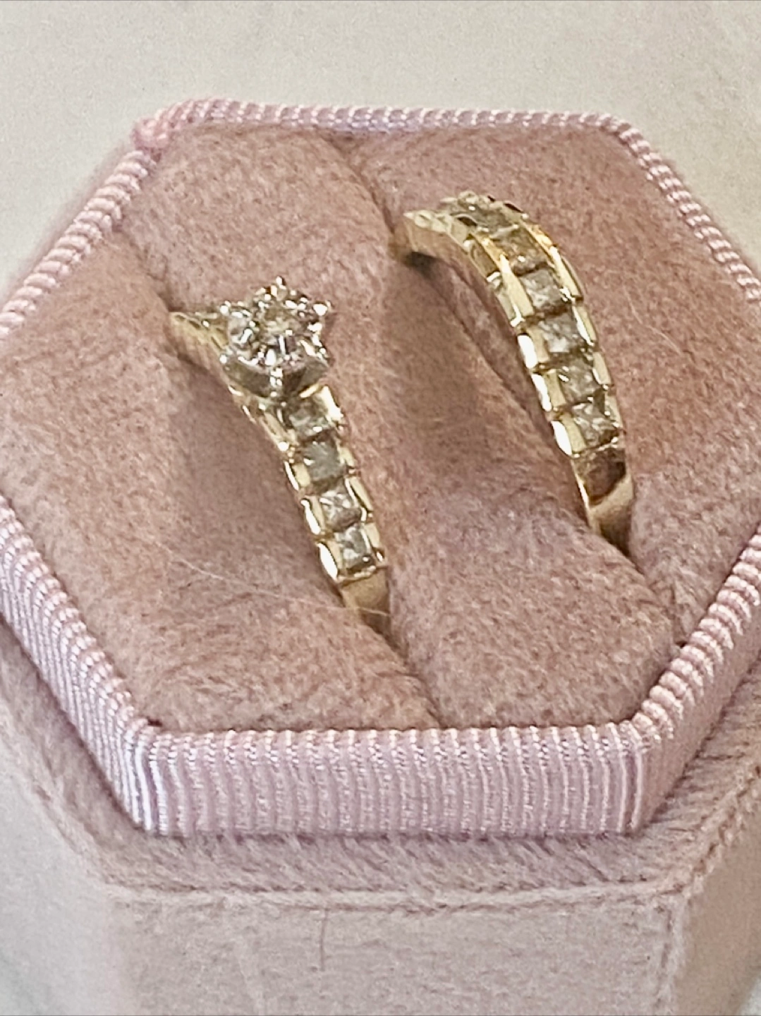 Selling a vintage diamond wedding sokid yellow 14k yellow gold ring set. It's in good condition and comes in a cute pink box. Perfect for someone who appreciates classic designs! Sold for $3000
