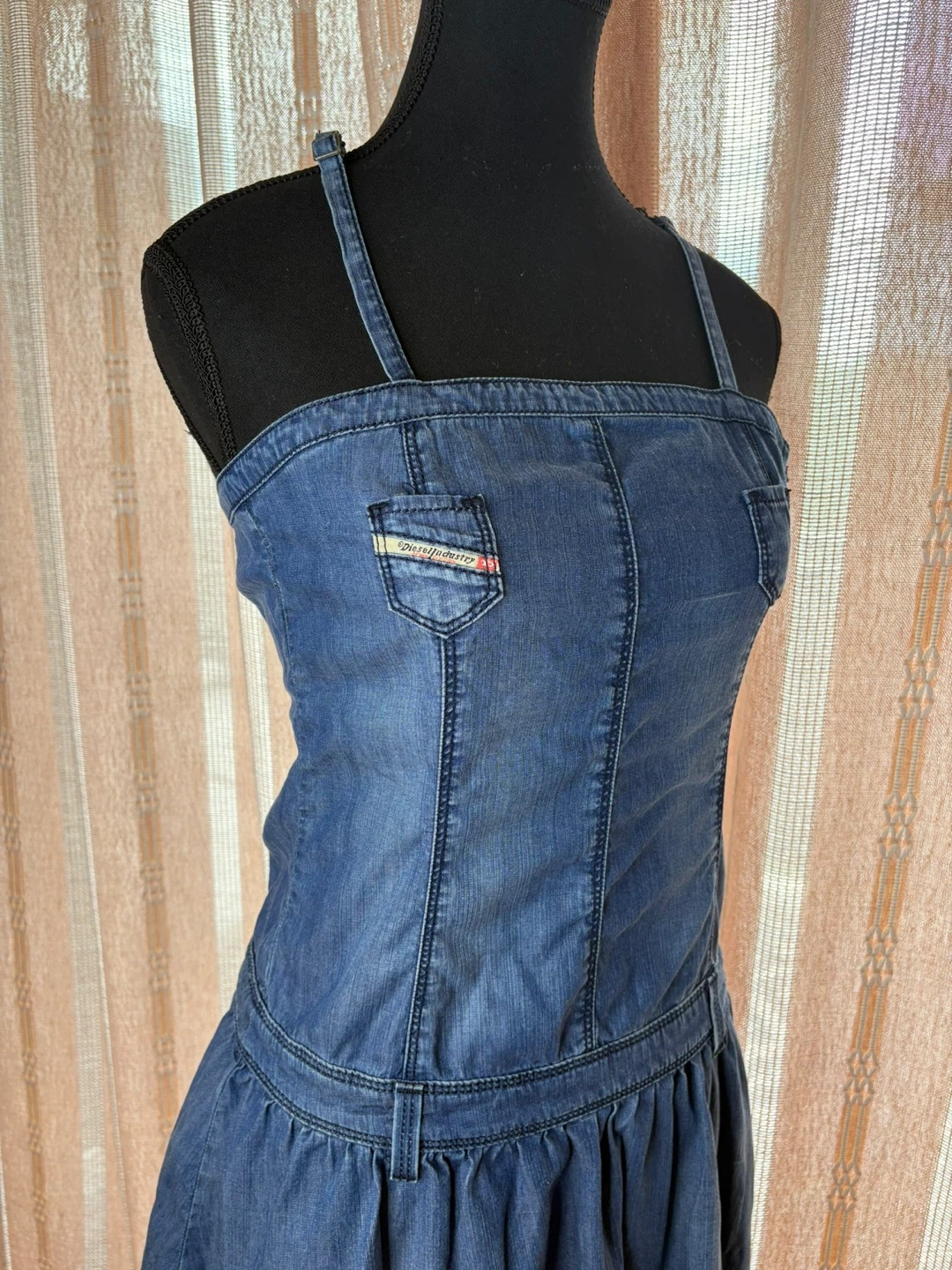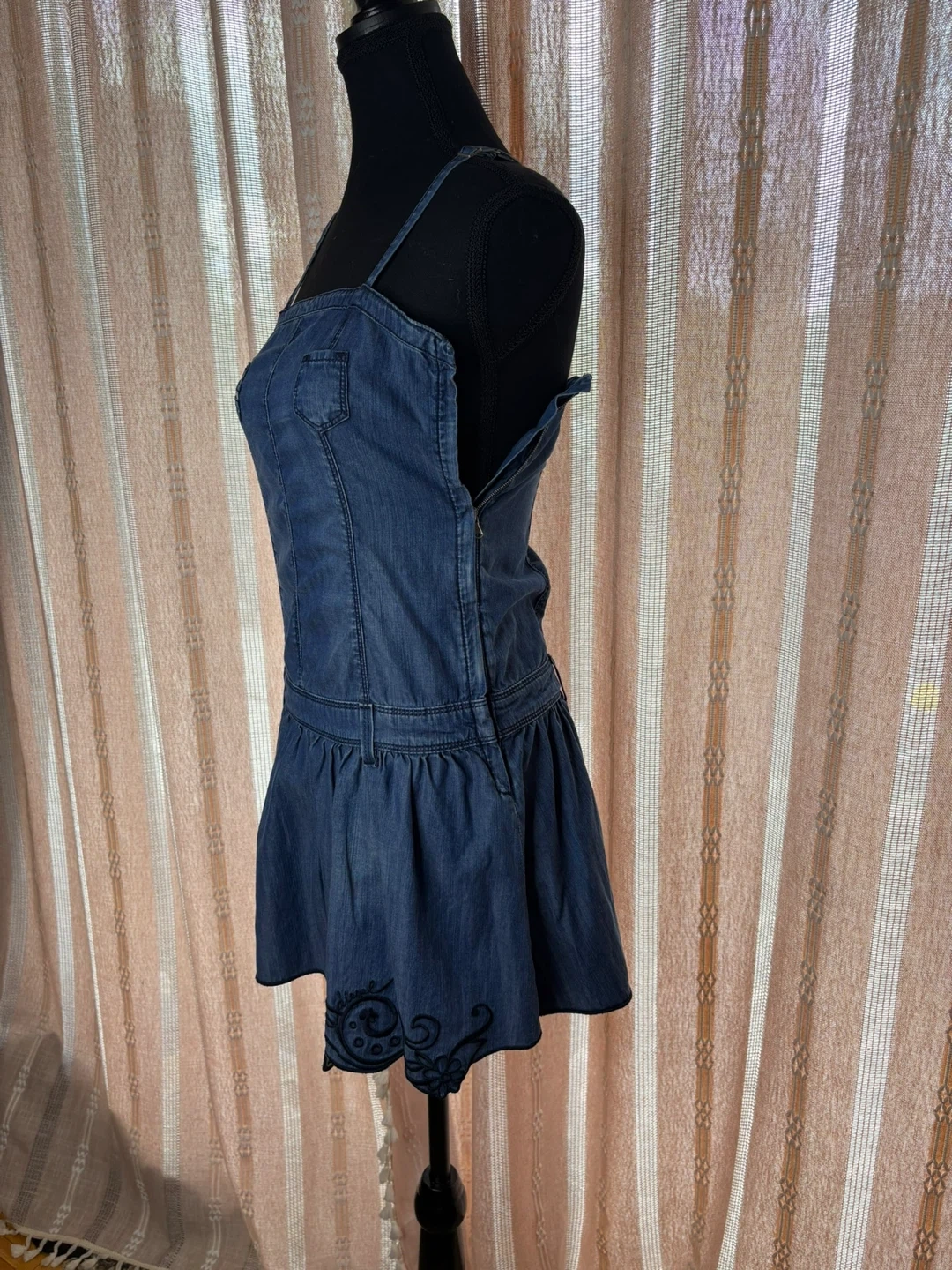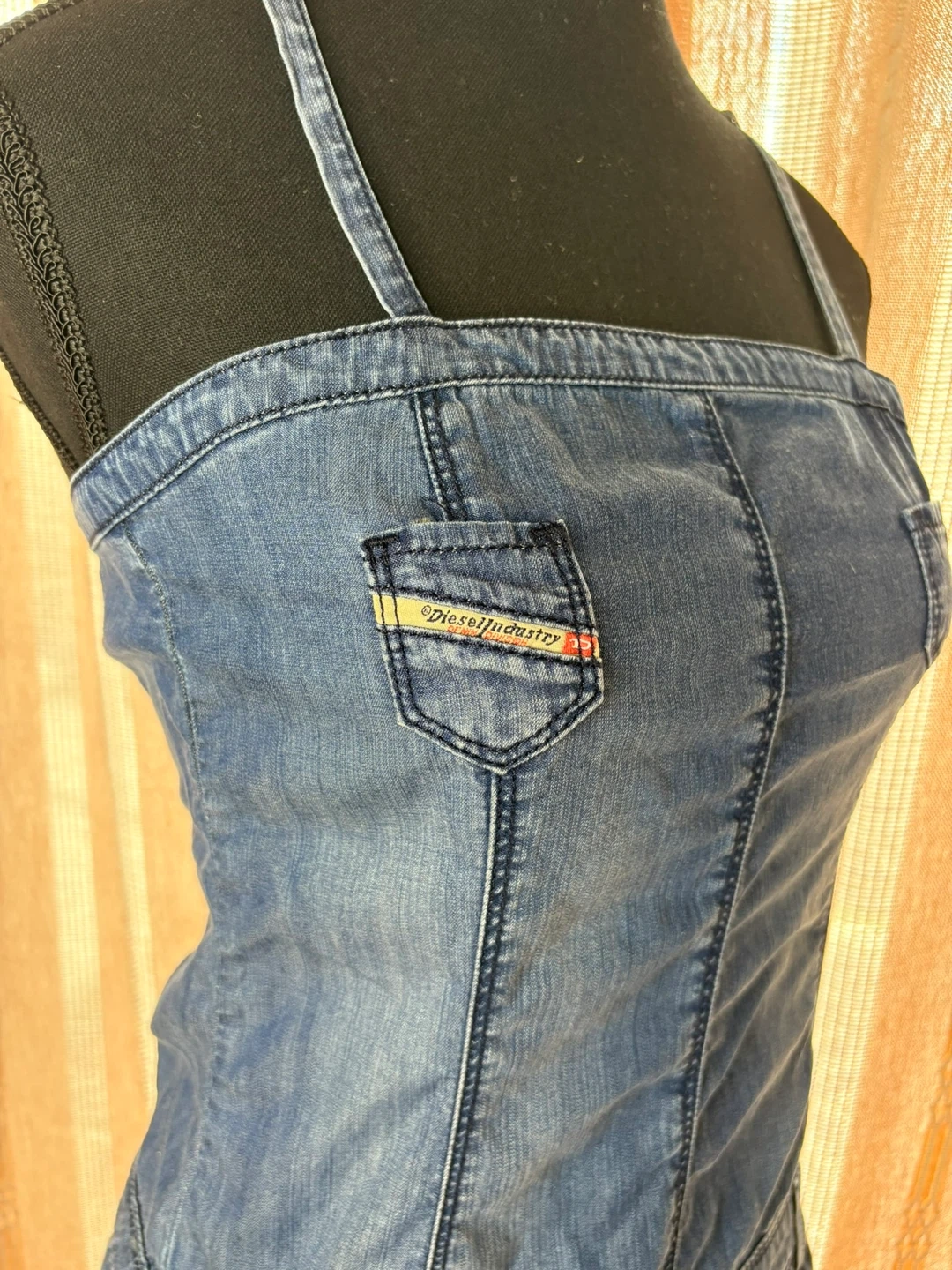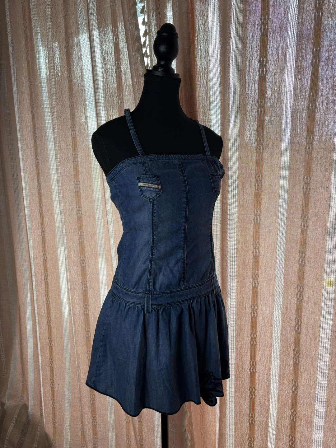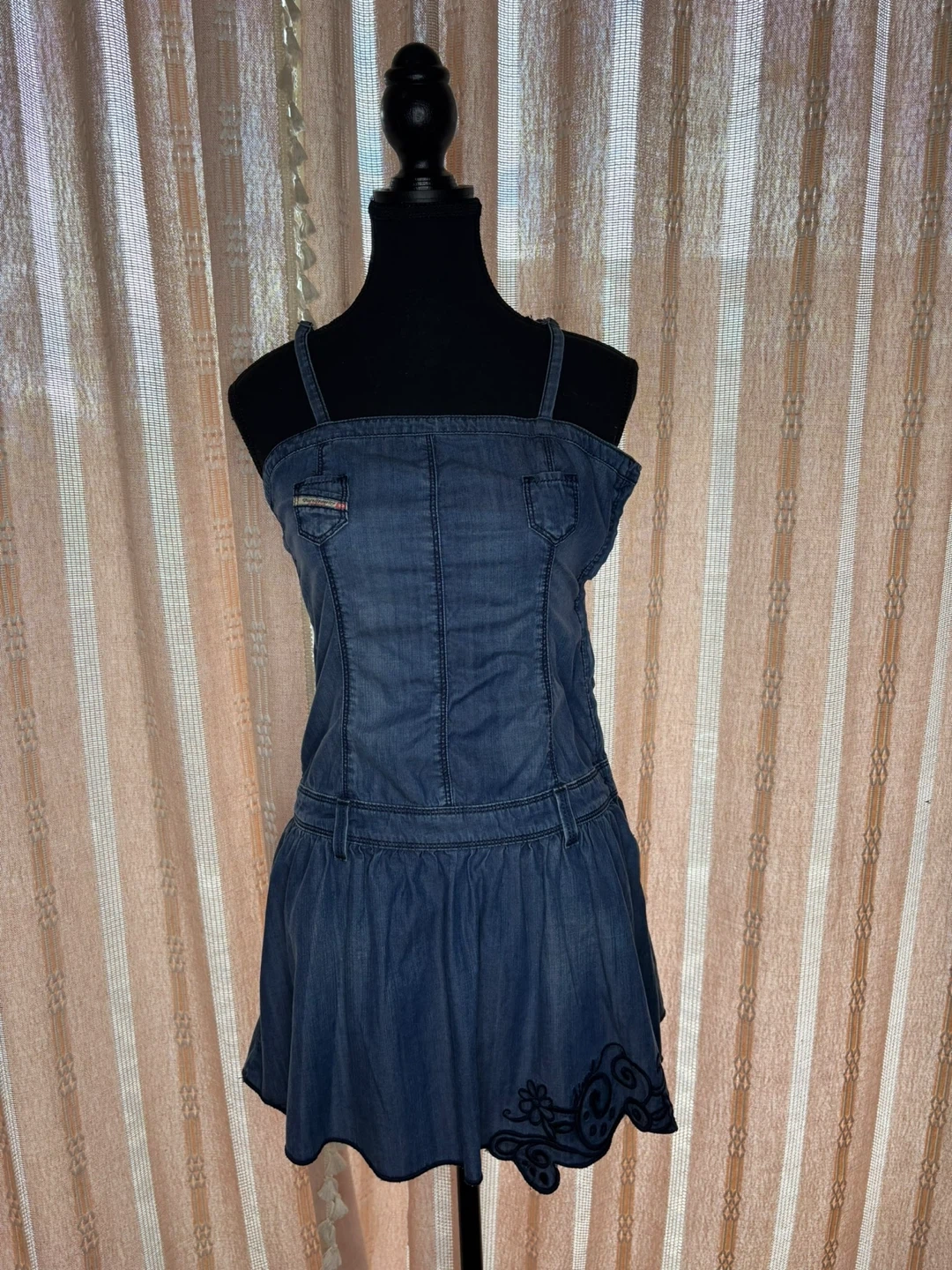 Rare early 2000s piece with classic Diesel details. Fitted corset-style bodice with cross-back straps. Flared skirt with embroidered floral hem. Side zip closure (zipper is in good condition, the dress is just too small for mannequin). Tagged 0, best fits XS Bust: 27" | Waist: 28" | Hips: 30" | Length: 24"