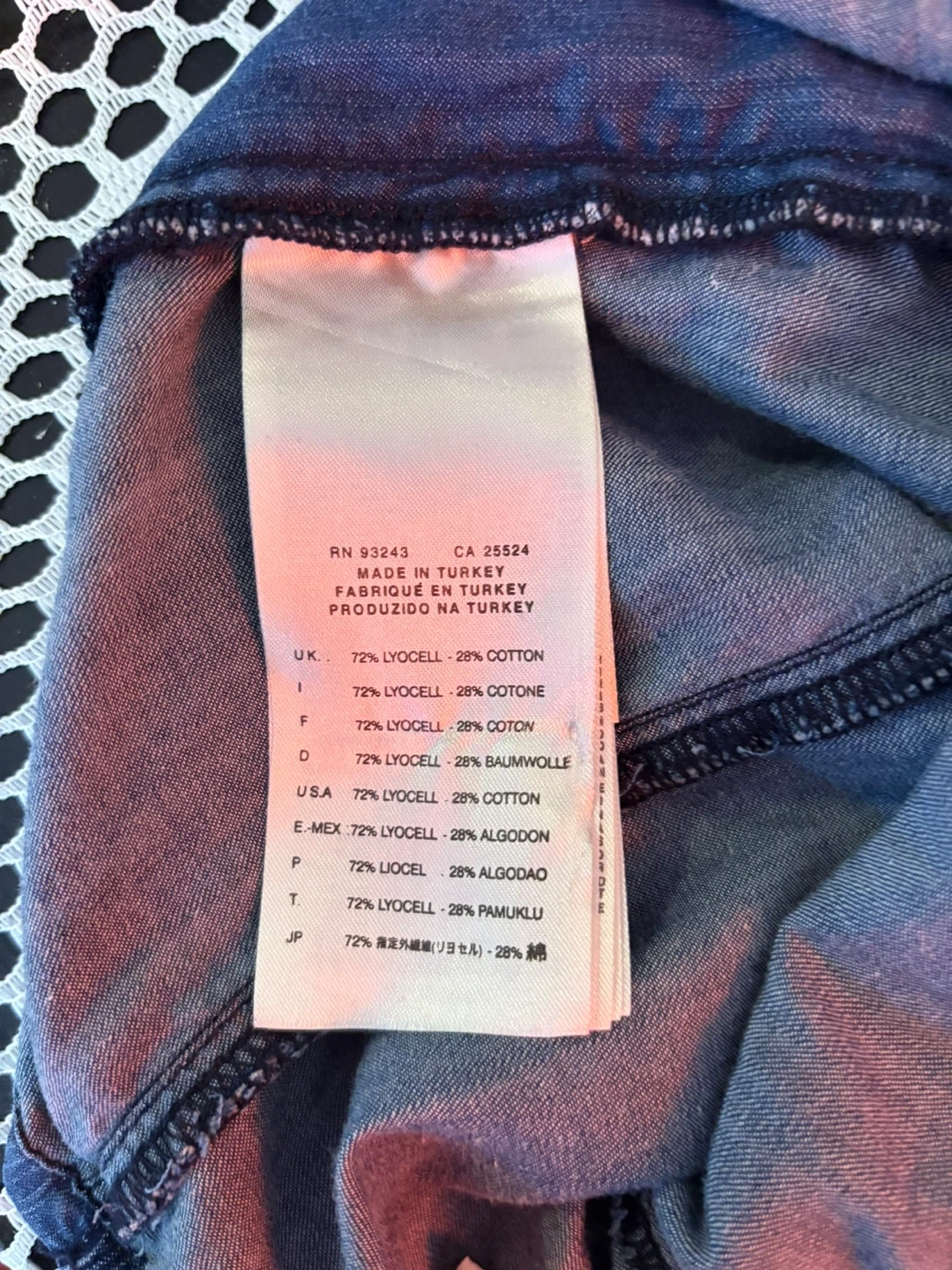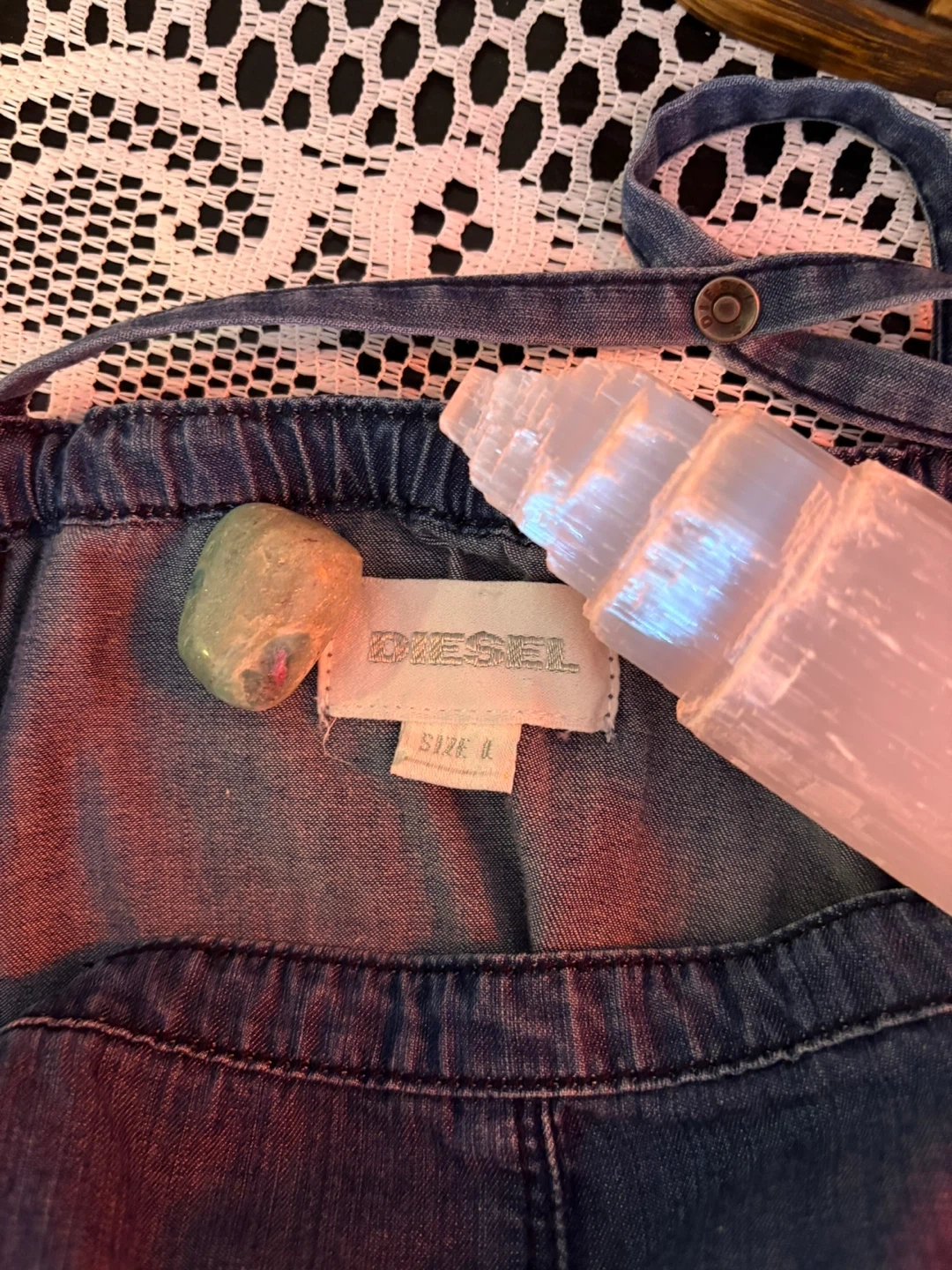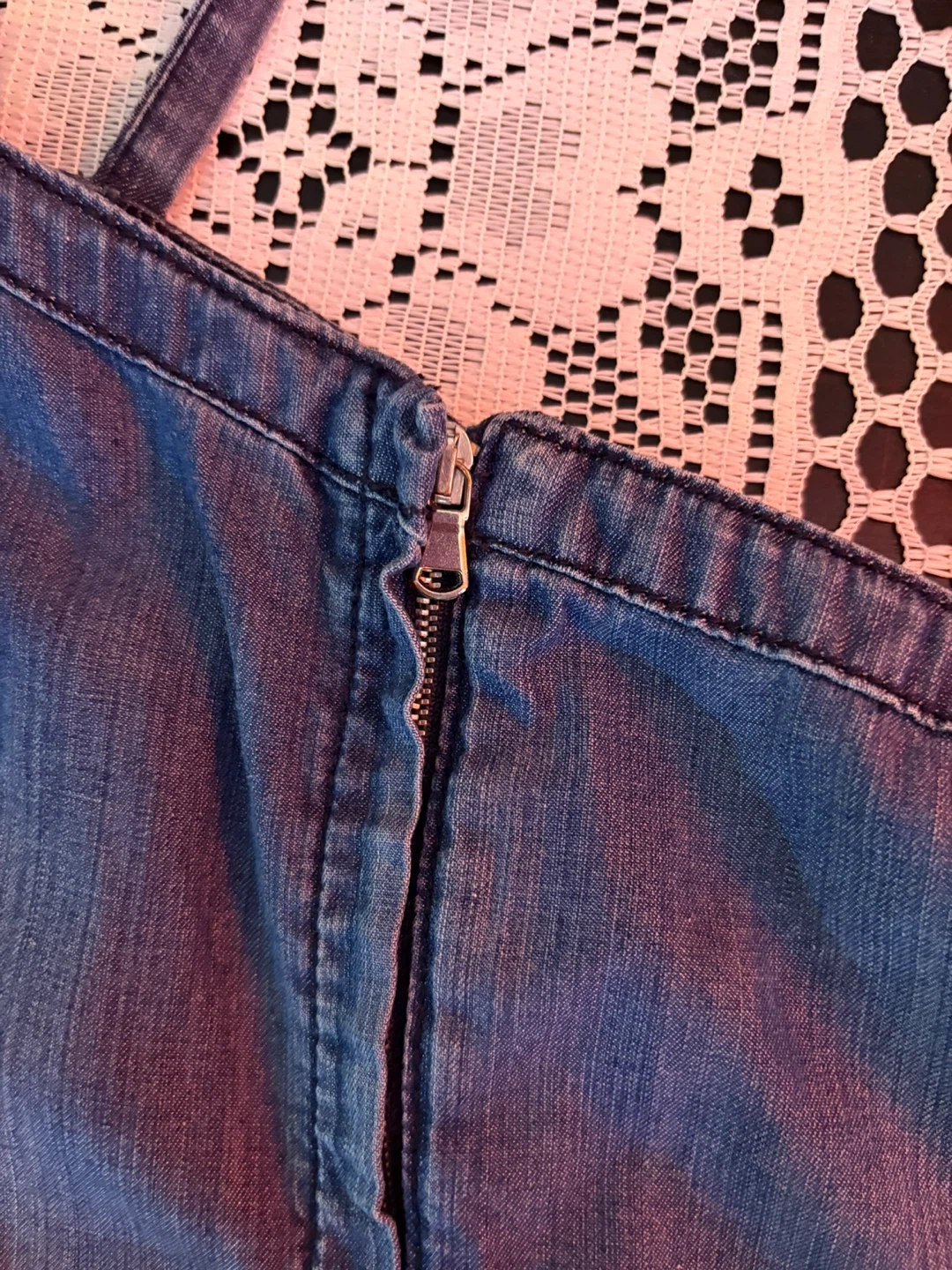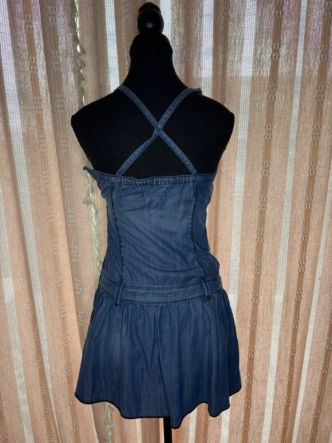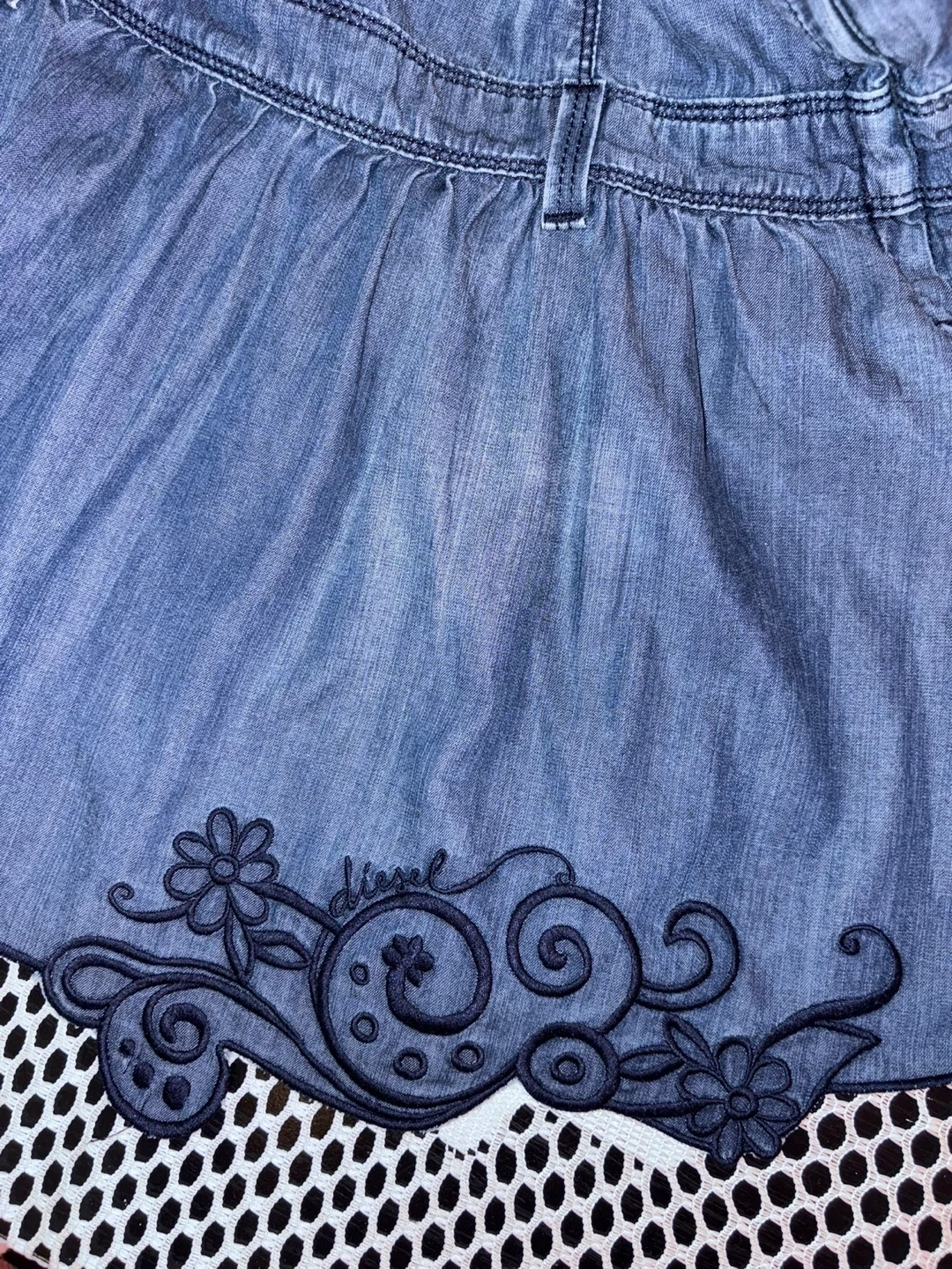 Rare early 2000s piece with classic Diesel details. Fitted corset-style bodice with cross-back straps. Flared skirt with embroidered floral hem. Side zip closure (zipper is in good condition, the dress is just too small for mannequin). Tagged 0, best fits XS Bust: 27" | Waist: 28" | Hips: 30" | Length: 24"