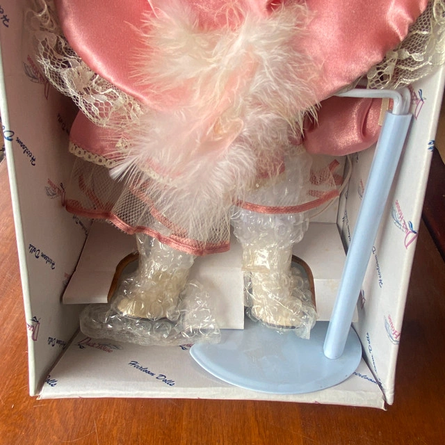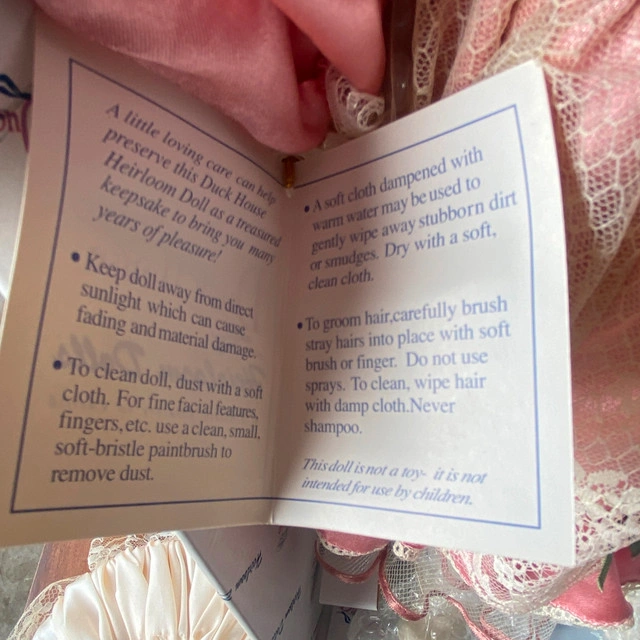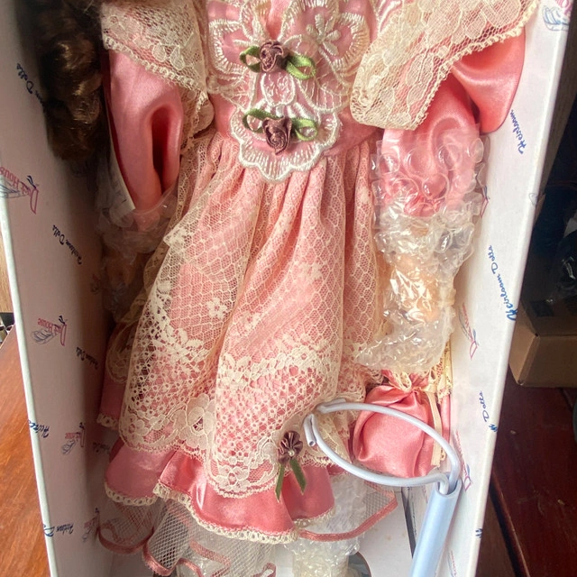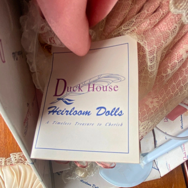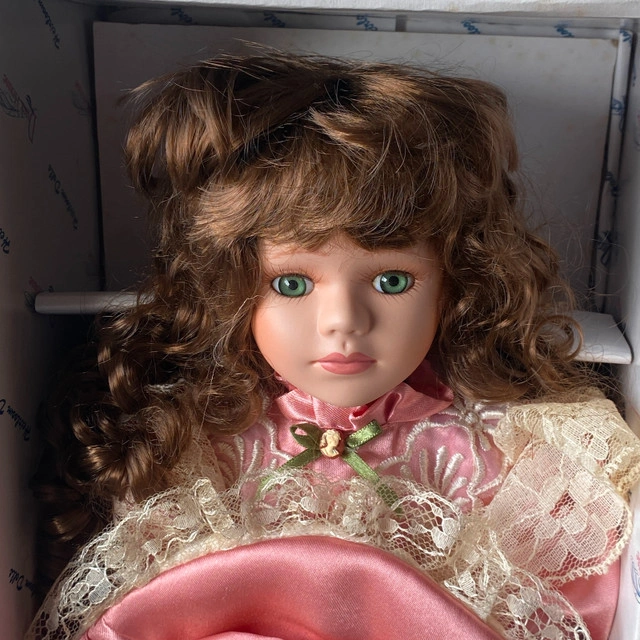 Add to your Collection. From our collection and well taken care of. Please see photos for the condition. Colors may not be accurate on the photos that are zoomed in, the camera may have adjusted due to lighting. Check my other listings, you may find what you’re looking for. Available for pick-up in SW Airdrie or Freeport Blvd NE Calgary on weekdays. Embrace the charm of yesteryear with the Vintage Duck House Heirloom 15" Doll, a rare find for collectors and enthusiasts alike. Crafted from fine porcelain, this delightful doll features rich brown curly hair and matching eyes that bring a touch of realism to her classic beauty. She arrives in her original opened box, having been treasured since her manufacture in the 1990s. This doll is a testament to the craftsmanship of the Duck House brand, known for their attention to detail and quality. She's dressed for all occasions, making her a versatile addition to any collection. Whether for display or play, this porcelain doll is a timeless piece that celebrates the artistry of vintage toy making.