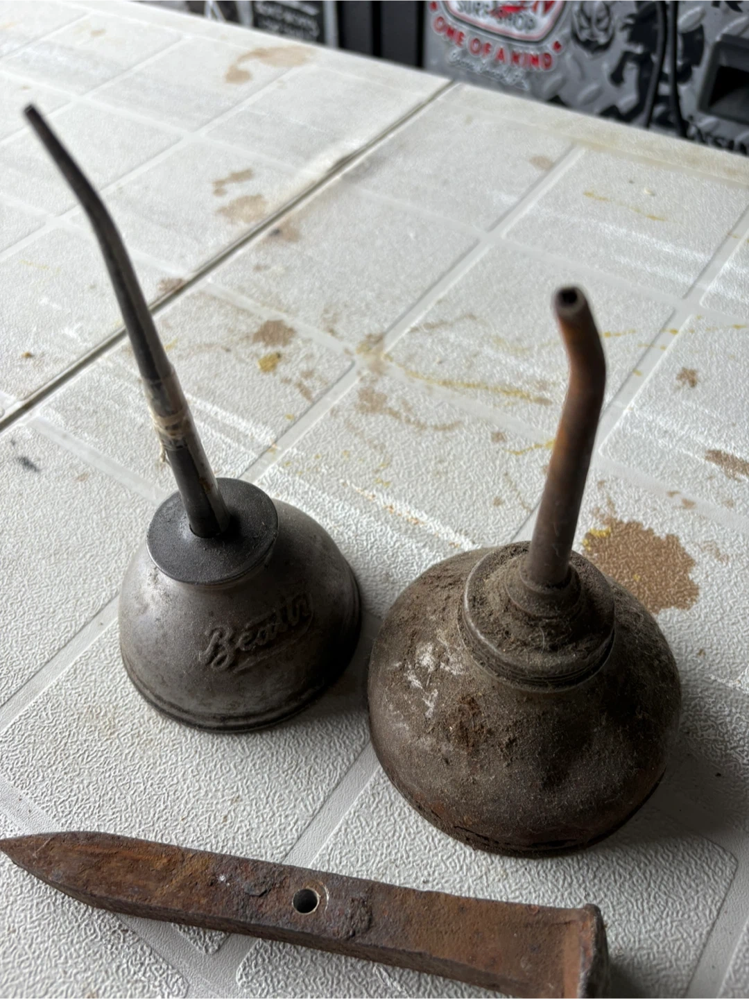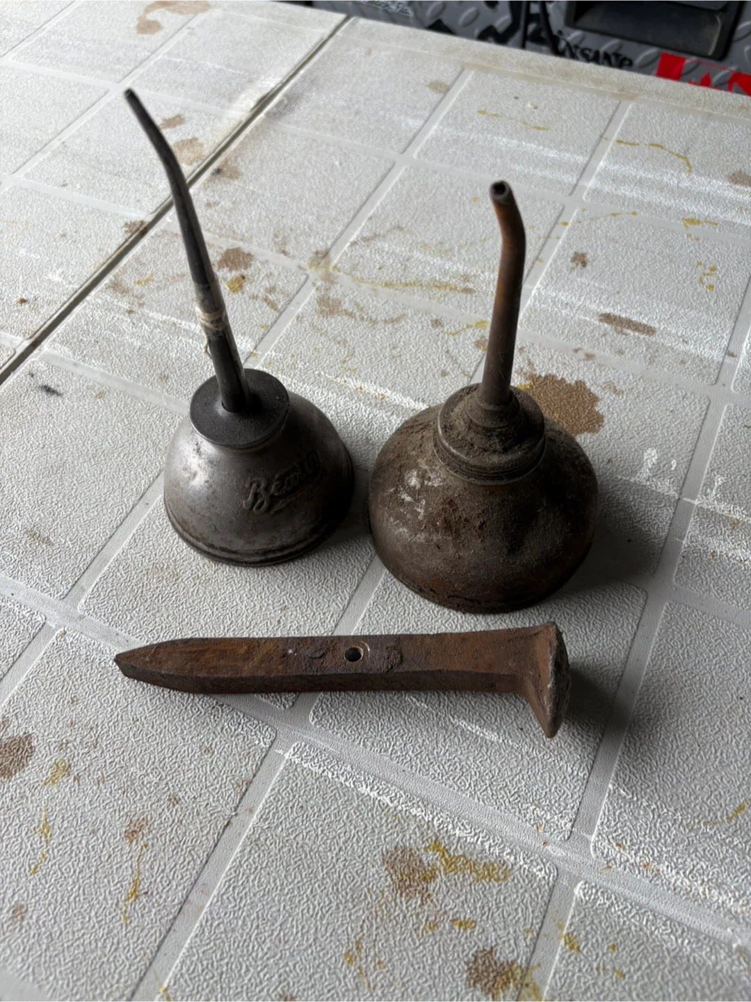 Selling a couple of vintage Eagle oil cans. One is in better shape than the other. Also included is a railroad spike. Great for collectors!