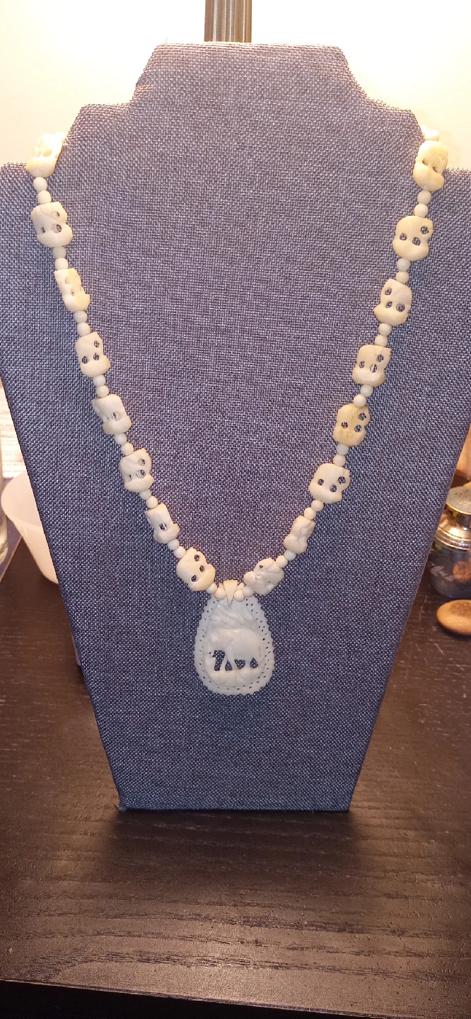 Unique necklace featuring detailed beads and an elephant pendant, crafted from bone. A cool statement piece! Imported from Africa many years ago. 21 inch chain. pendant is 2 inches tall.