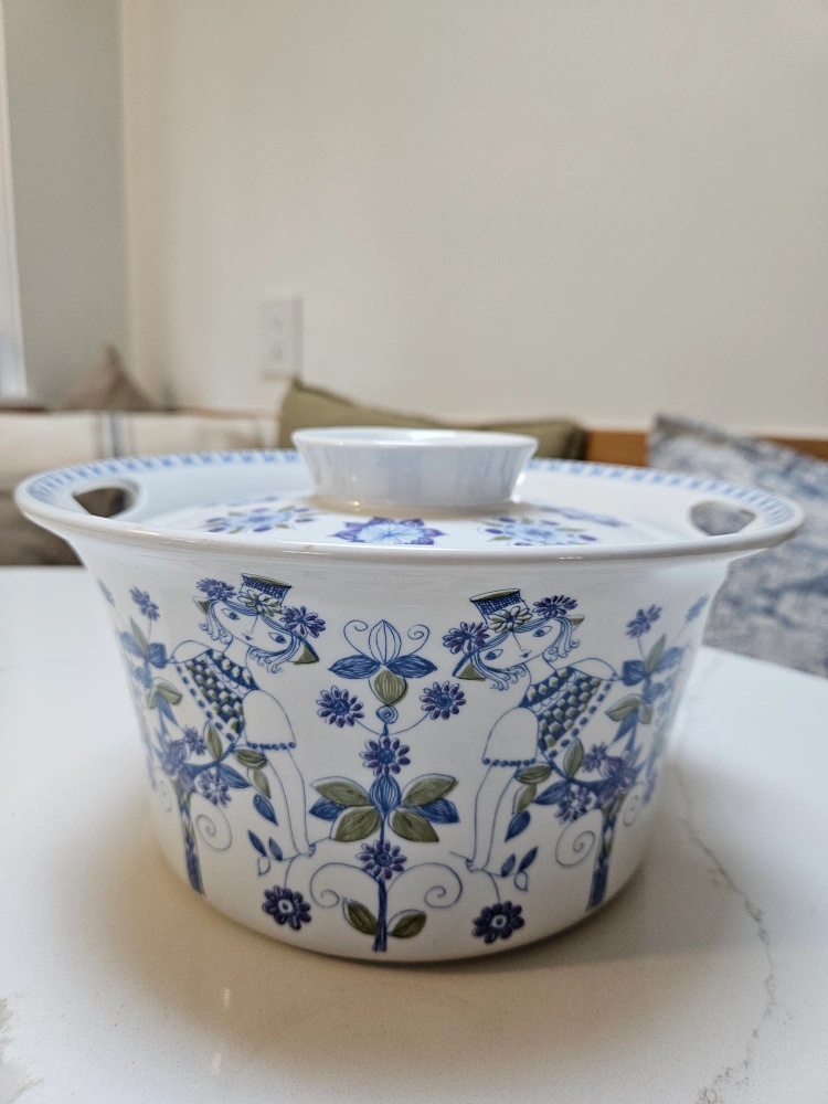 Vintage Figgjo Flint Norway Turi Lotte Design White and Blue Casserole Dish with Lid Hand painted on silkscreen Vintage scandinavian serverware Perfect for serving up your favourite dishes!