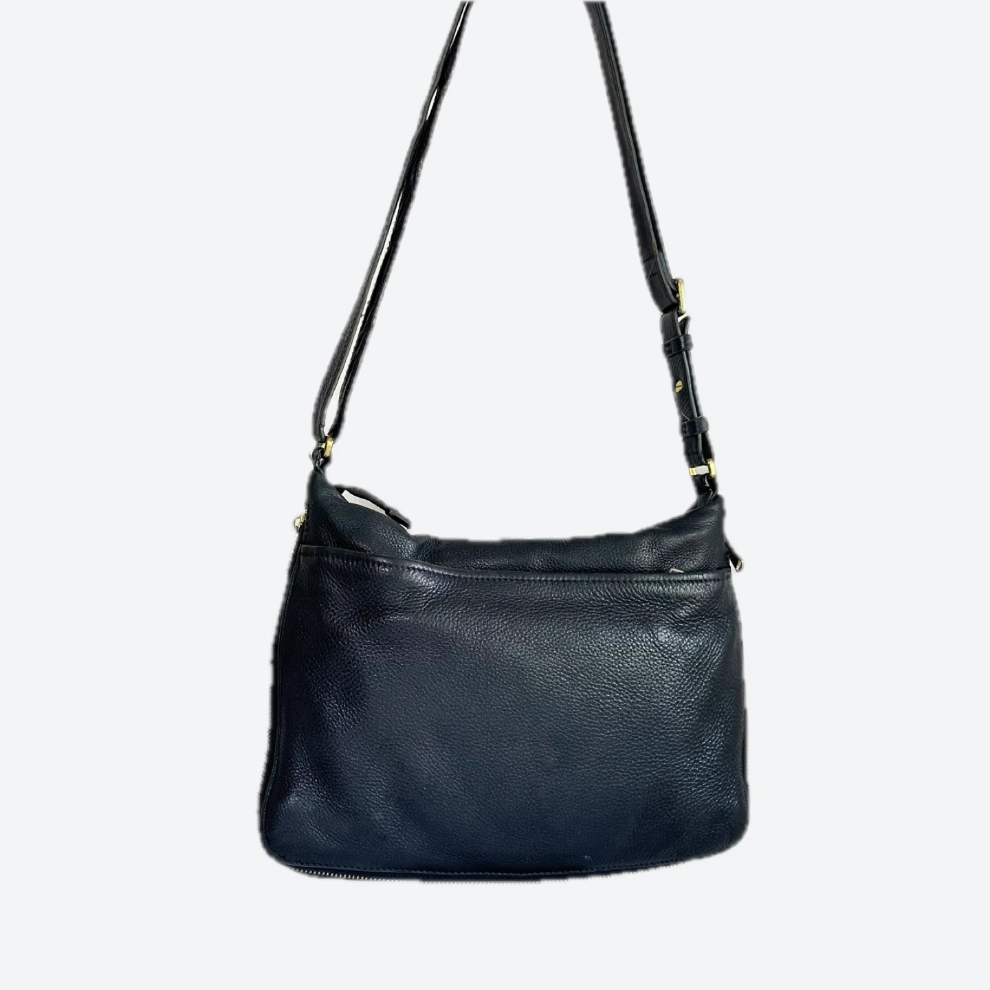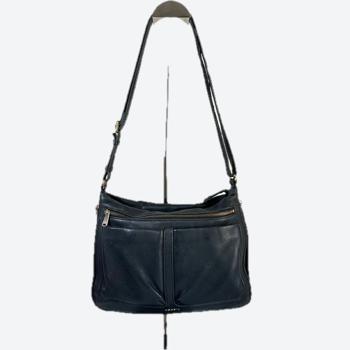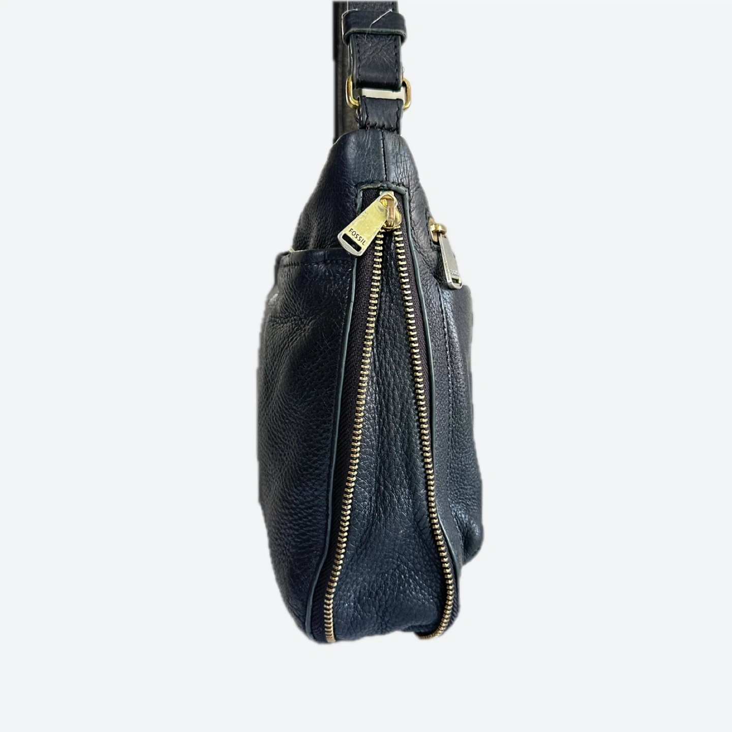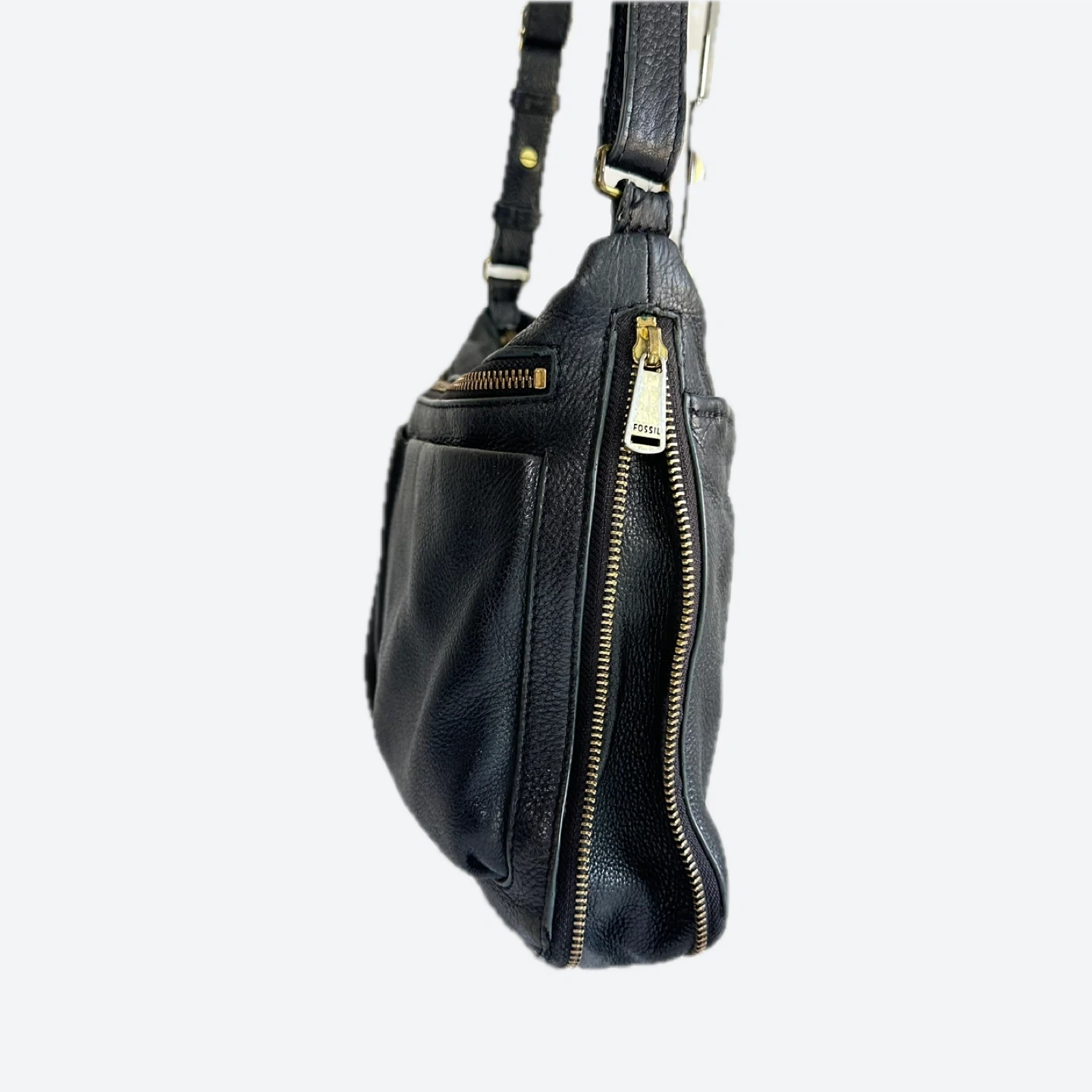 This is a Fossil crossbody bag in black leather. It's in great condition and ready for a new home! Perfect for everyday use or travel. • Fossil Piper Black Pebbled Leather Crossbody Bag: Timeless, versatile design with a gold logo. • Expandable & Organized: Features a zip-top closure and multiple interior zip pockets. • Adjustable Strap: Wear it as a crossbody for comfortable, hands-free use Length : 12 inch Width : 7 inch Depth : 3 inch Expanded : 4 inch Shortest Strap drop : 14 inch Longest strap drop : 26 inch