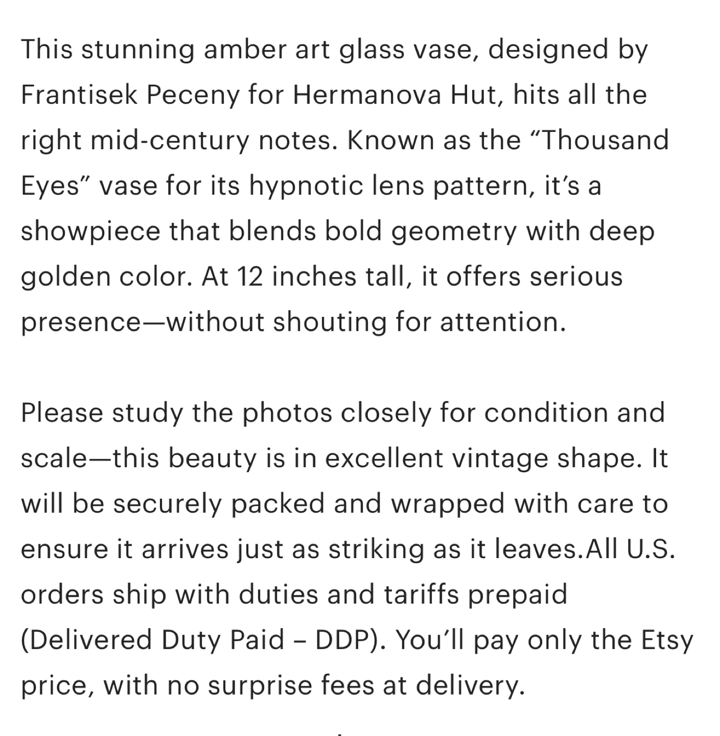 Selling a vintage Frantisek Peceny amber lens vase. It's a beautiful 1960 piece with a unique design , 12 inches tall . Originally listed for CA$204.00, now reduced to CA$153.00!