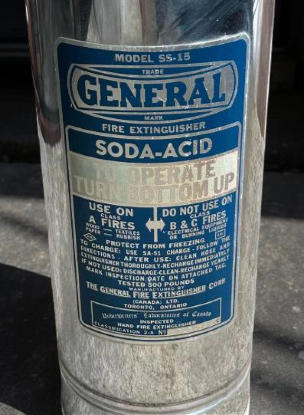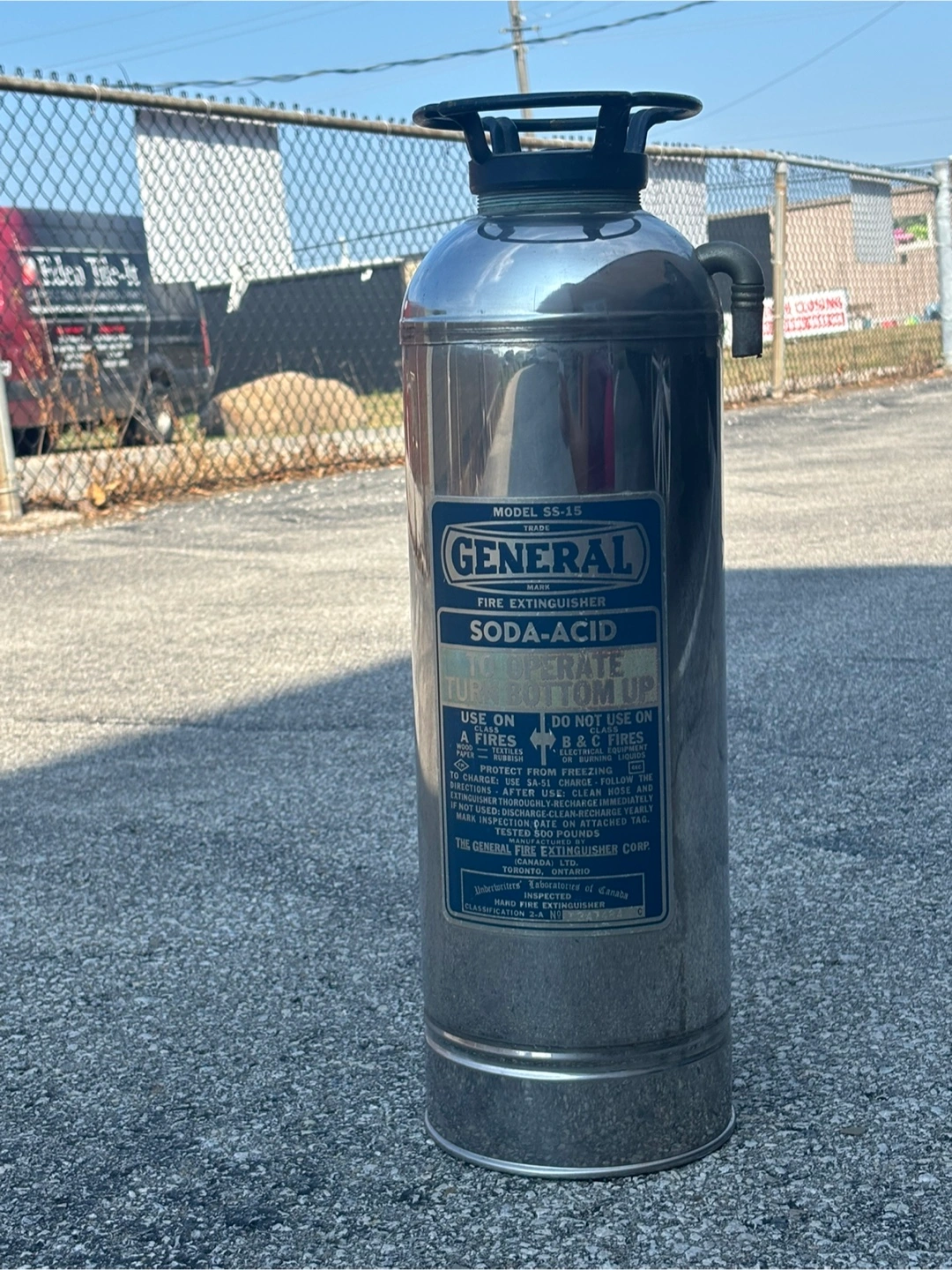 General Soda Acid Fire Extinguisher, Model SS-15. Good condition with no dents, or dings. Empty. Measurements: 23"H x 7"D