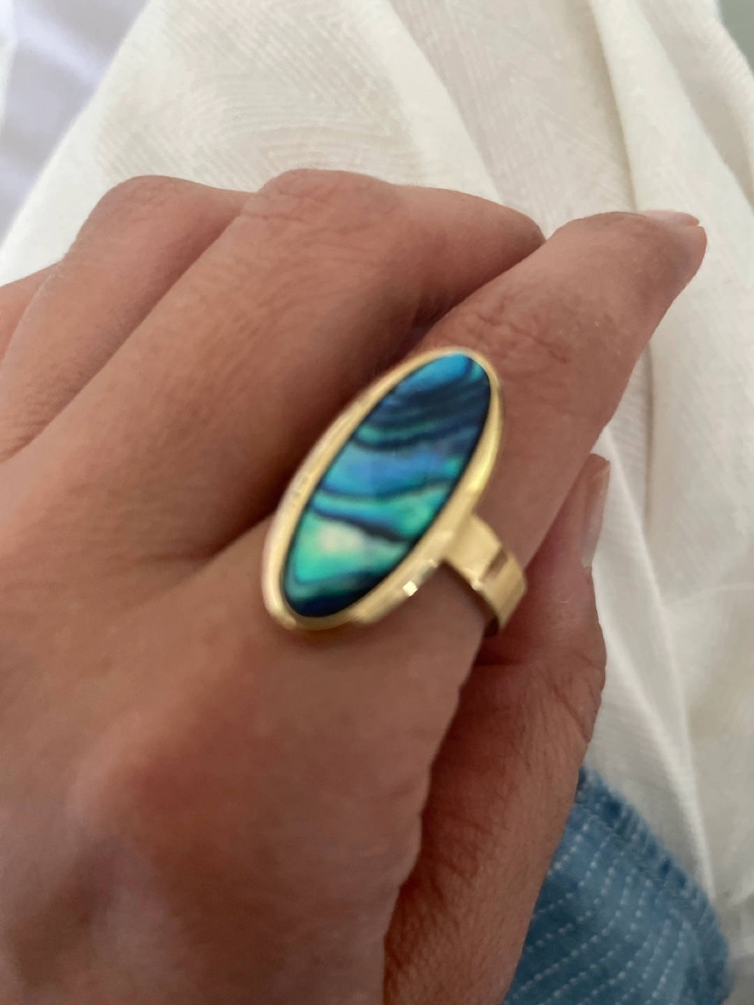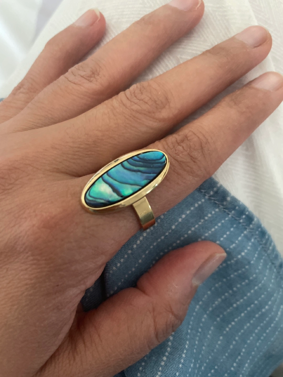 Selling a vintage ring with a beautiful abalone stone set in a gold-tone setting. It's in great condition and would make a lovely addition to any jewelry collection