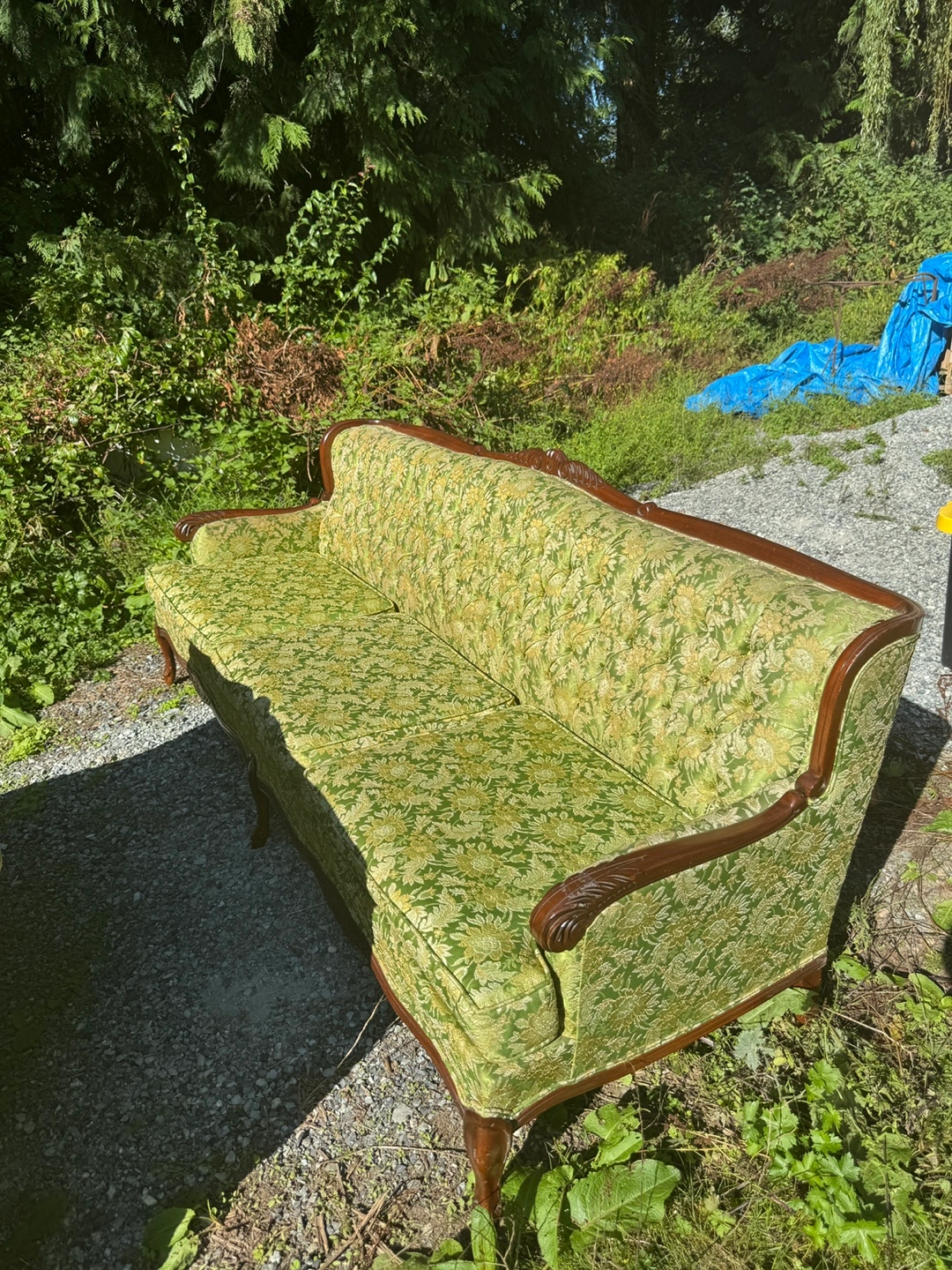 Selling a vintage sofa with a lovely green floral pattern. The wood trim has a beautiful carved detail. It is in good condition and would be a charming addition to any home