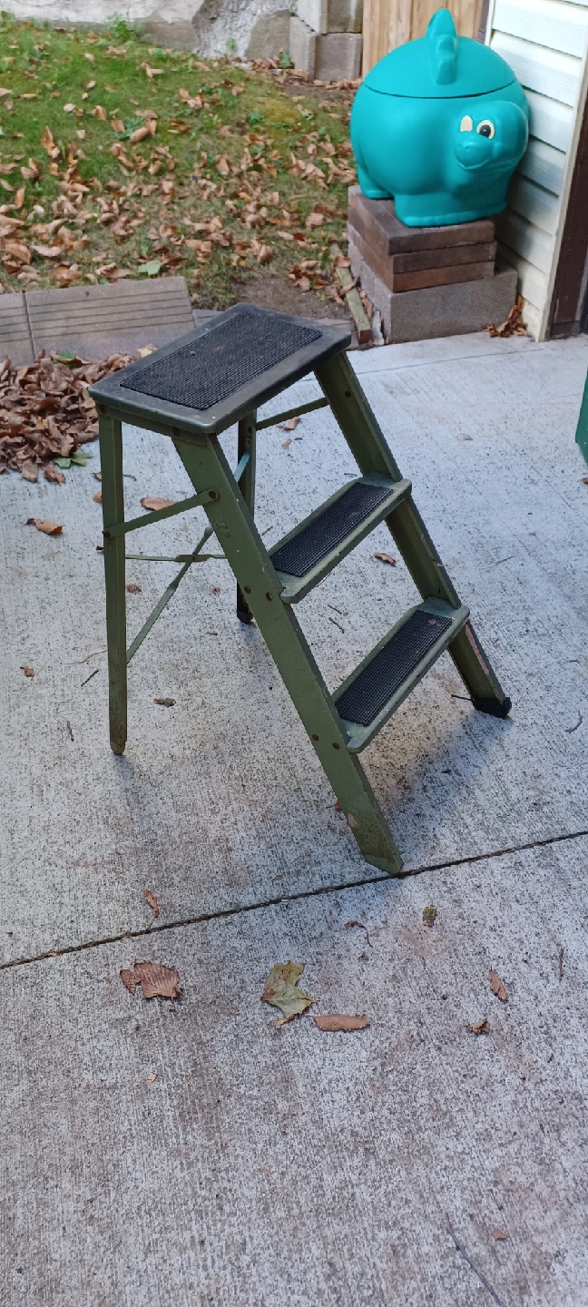 Selling a vintage green 3 step ladder. It has three steps with a black textured surface. Perfect for reaching those high shelves! PLEASE CALL NOT TEXT.... 519 729-5862 415 Victoria st south kitchener