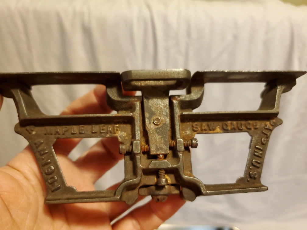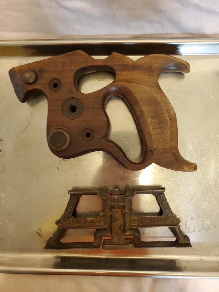 Both for 25$. Selling a vintage H. Disston & Sons saw handle and a Maple Leaf saw gauge. Both pieces show signs of age and use, adding to their character. The handle is made of wood and the gauge is metal. A great addition to any collection!
