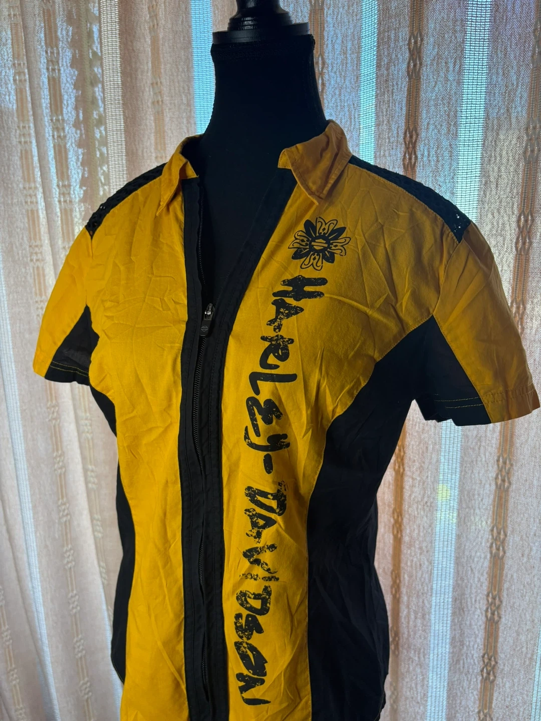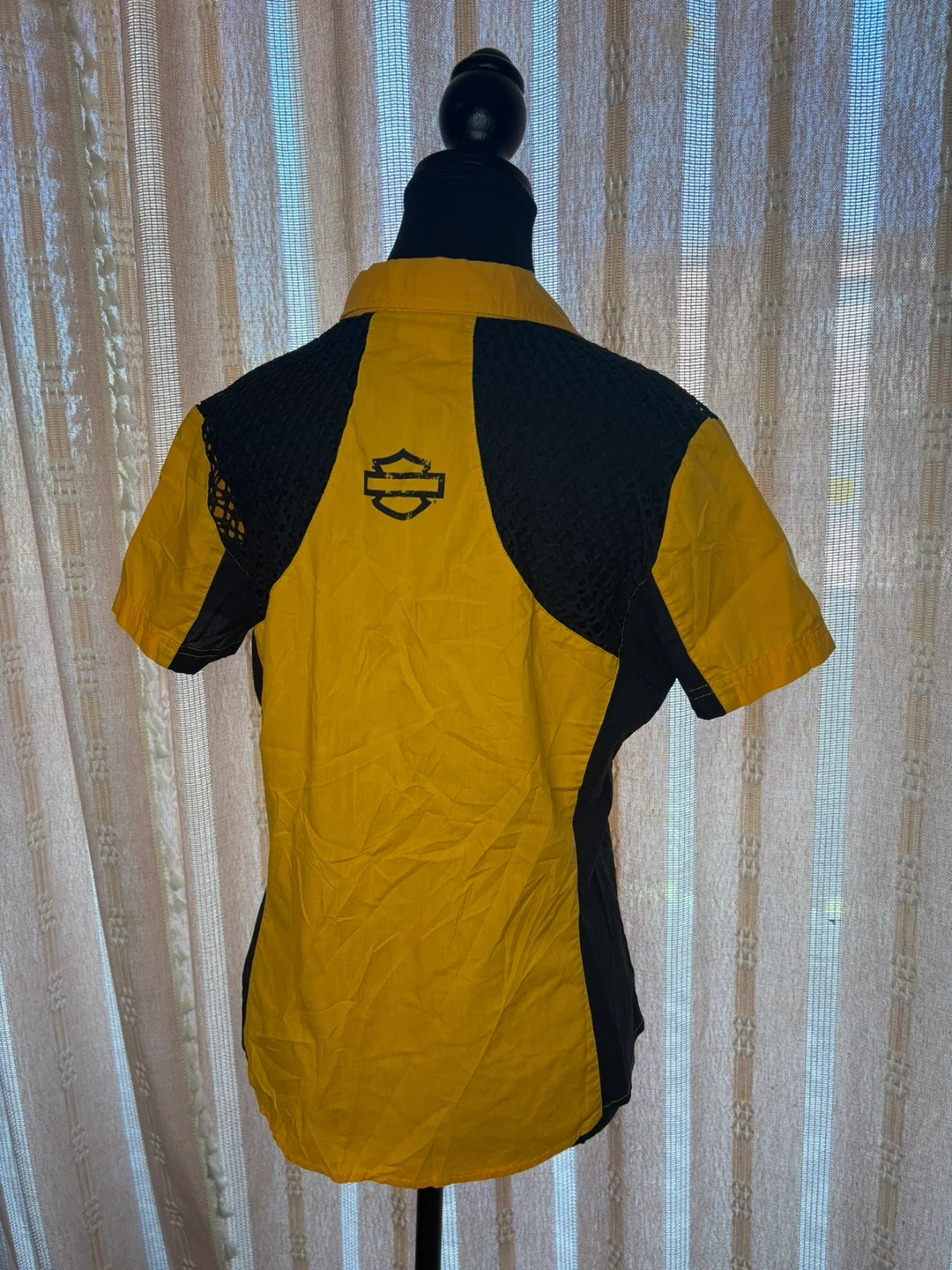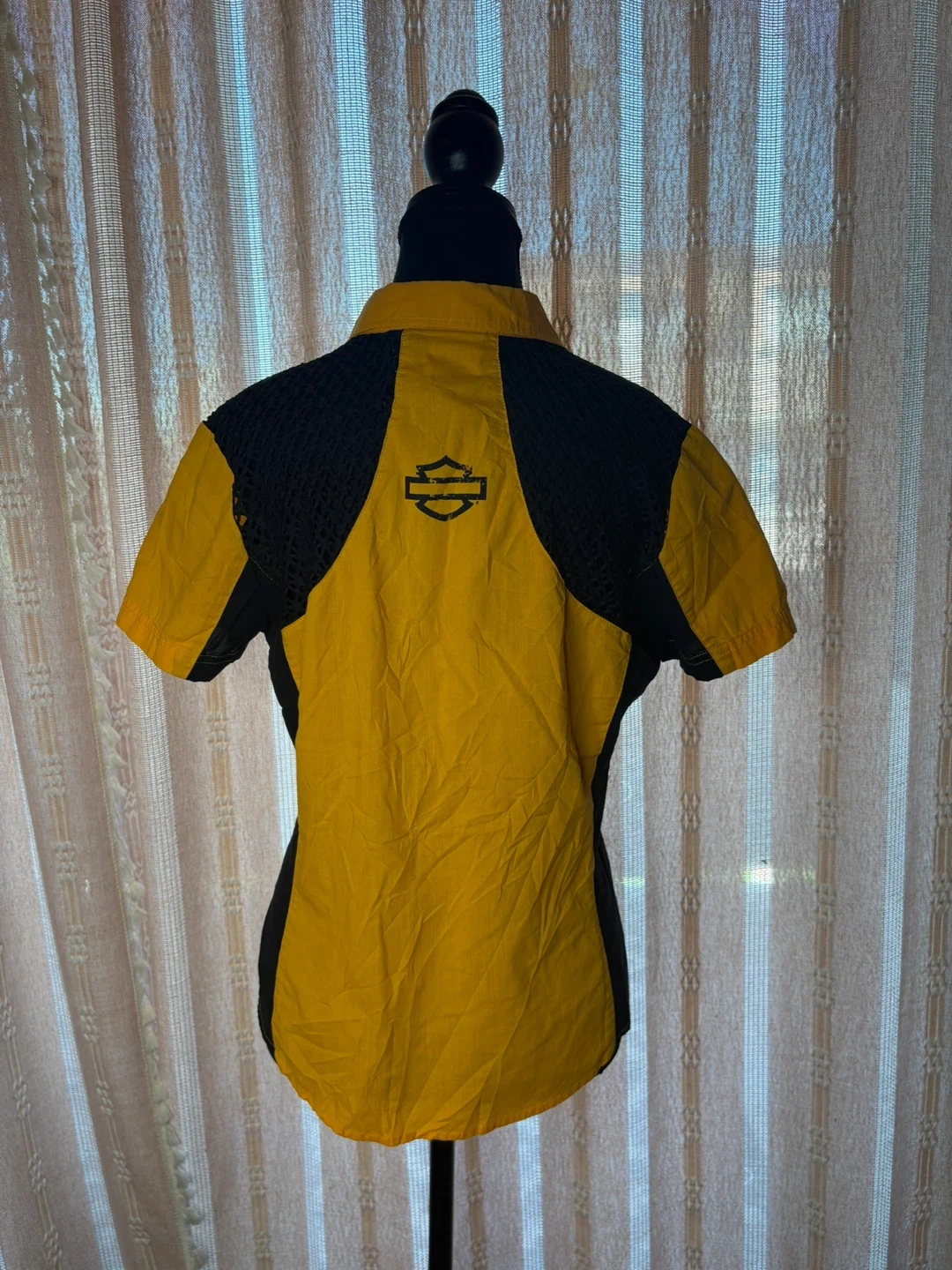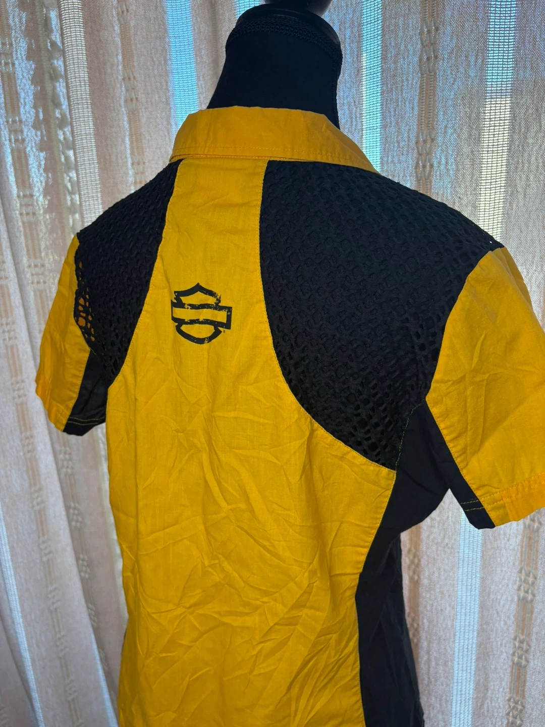 Rare vintage Harley-Davidson short-sleeve zip-up shirt in bold yellow and black colorblock. Features embroidered Harley logo, racing-style graphics on the front, and the classic shield logo on the back. Mesh shoulder panels add breathability and give it that sporty moto edge. Zip front closure with Harley zipper pull. Cotton/poly blend with spandex for stretch. Authentic Harley-Davidson Genuine MotorClothes label. Tagged M, best fits M/L Bust: 36" | Waist: 34" | Length: 24"