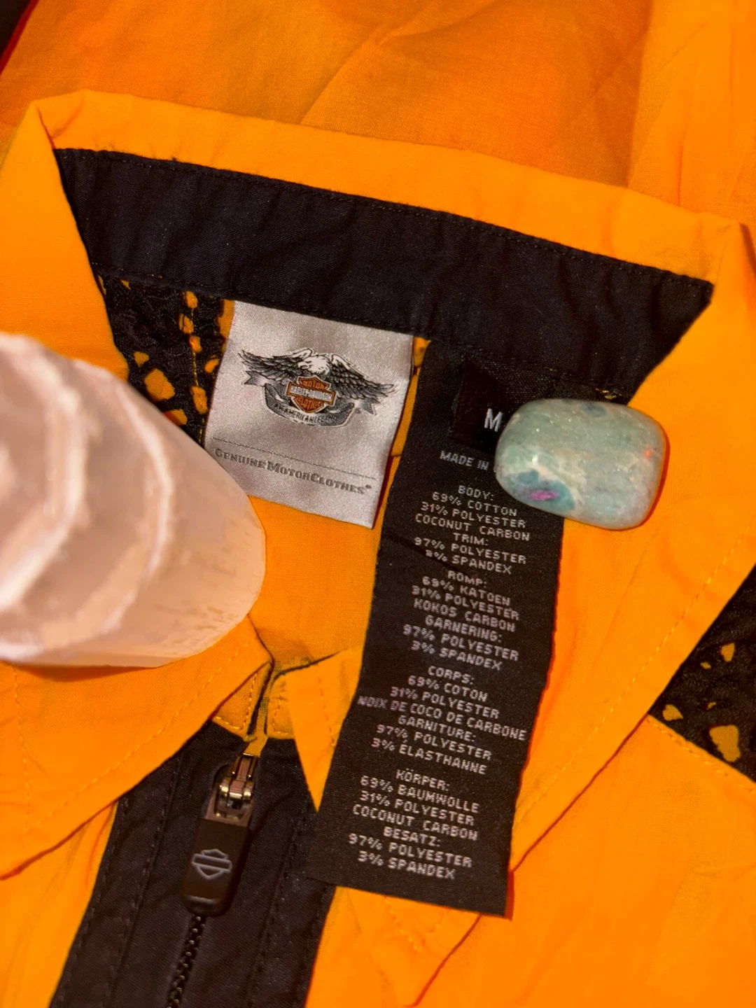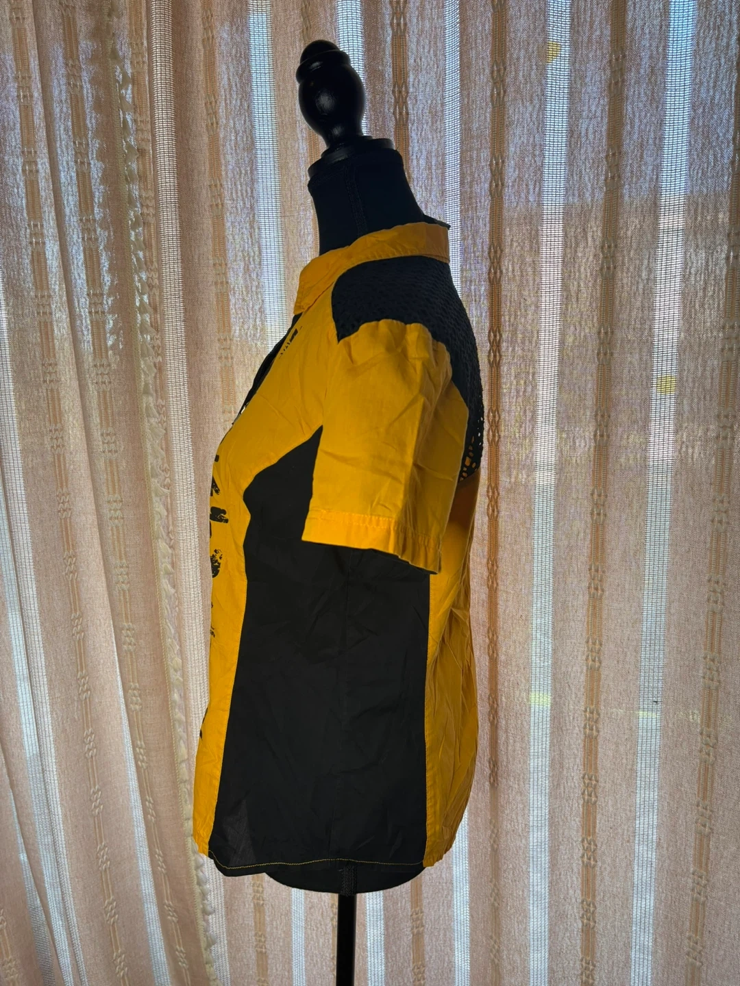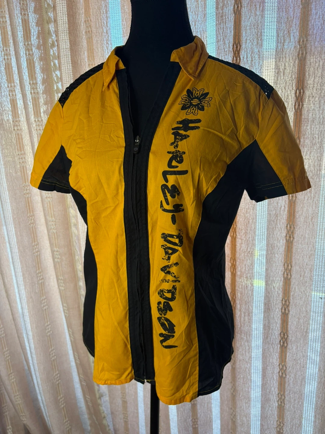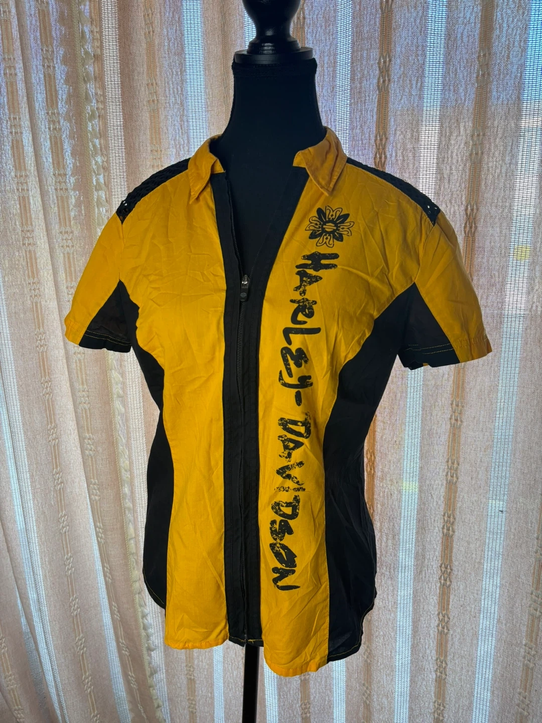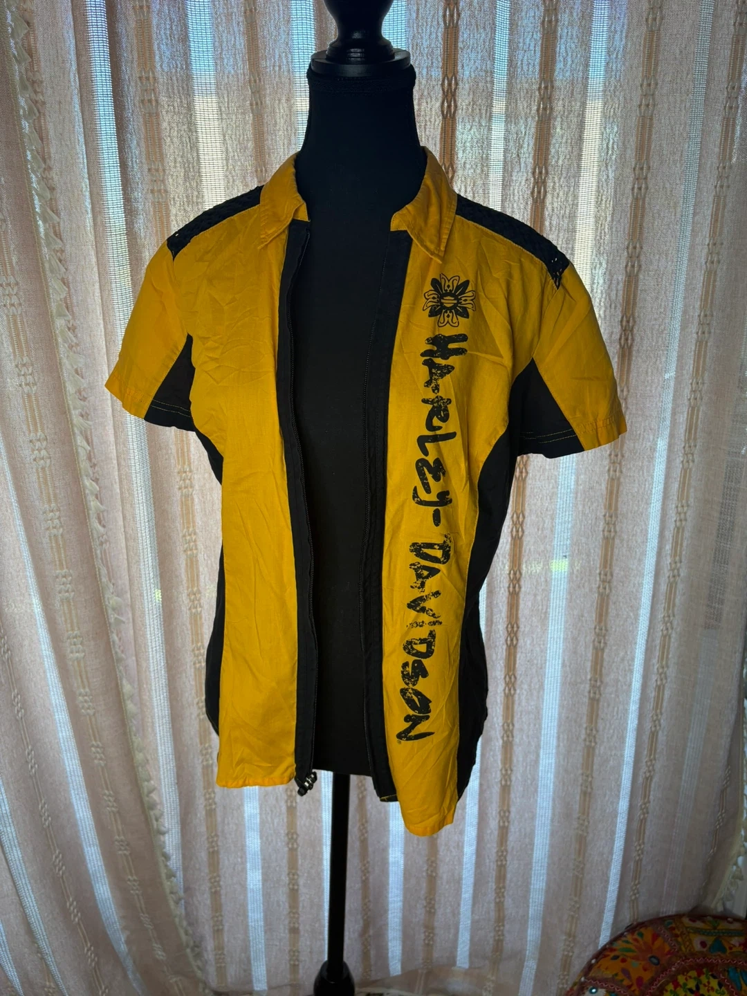 Rare vintage Harley-Davidson short-sleeve zip-up shirt in bold yellow and black colorblock. Features embroidered Harley logo, racing-style graphics on the front, and the classic shield logo on the back. Mesh shoulder panels add breathability and give it that sporty moto edge. Zip front closure with Harley zipper pull. Cotton/poly blend with spandex for stretch. Authentic Harley-Davidson Genuine MotorClothes label. Tagged M, best fits M/L Bust: 36" | Waist: 34" | Length: 24"