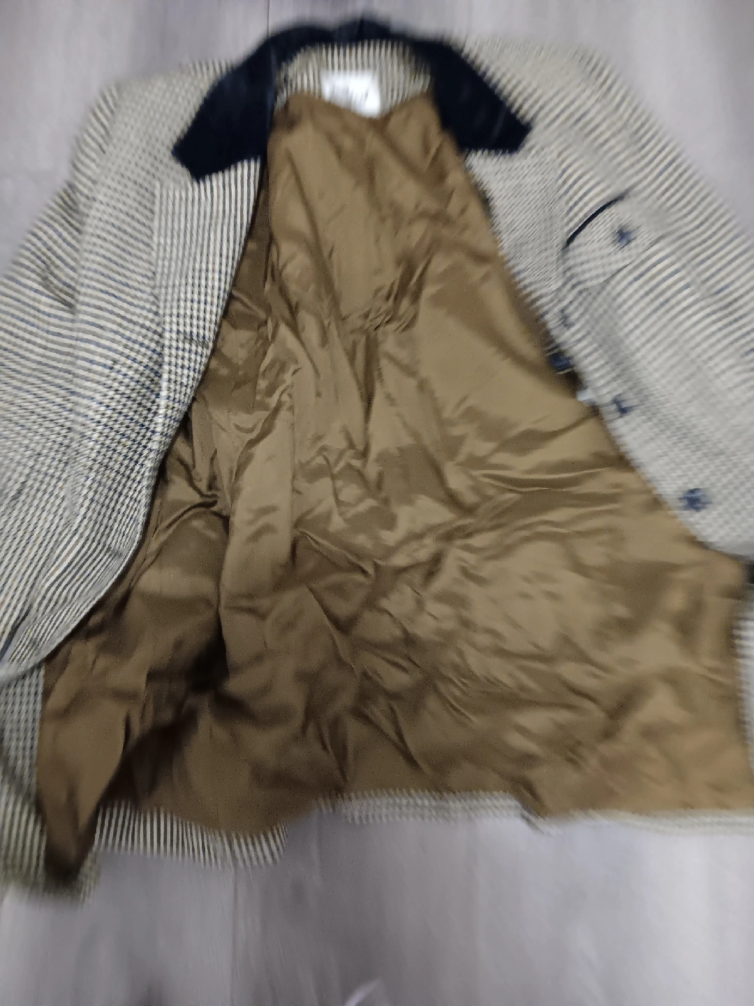 Selling a vintage blazer with a classic houndstooth pattern! It features a dark velvet collar and a silky brown lining. The blazer is in good condition and ready for a new home!
