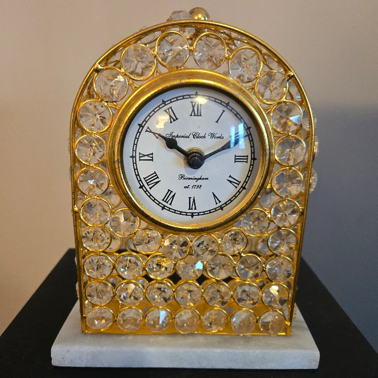 Works! 1971 bermingham Crystal and Gold-toned metal frame. Marble base. Roman numeral clock face. Looks great on a desk or mantle.