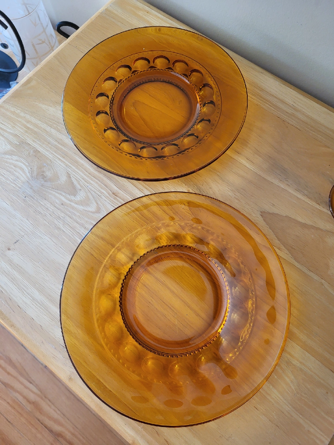 These are vintage Indiana Glass Tiara Sandwich plates in a lovely amber colour. They're in great condition and would be a wonderful addition to any collection or for everyday use! They have a beautiful beaded design around the edge. Set of 2