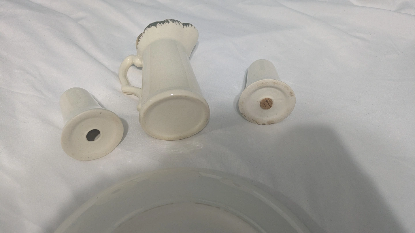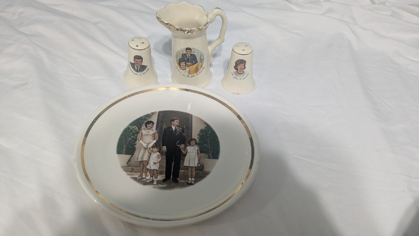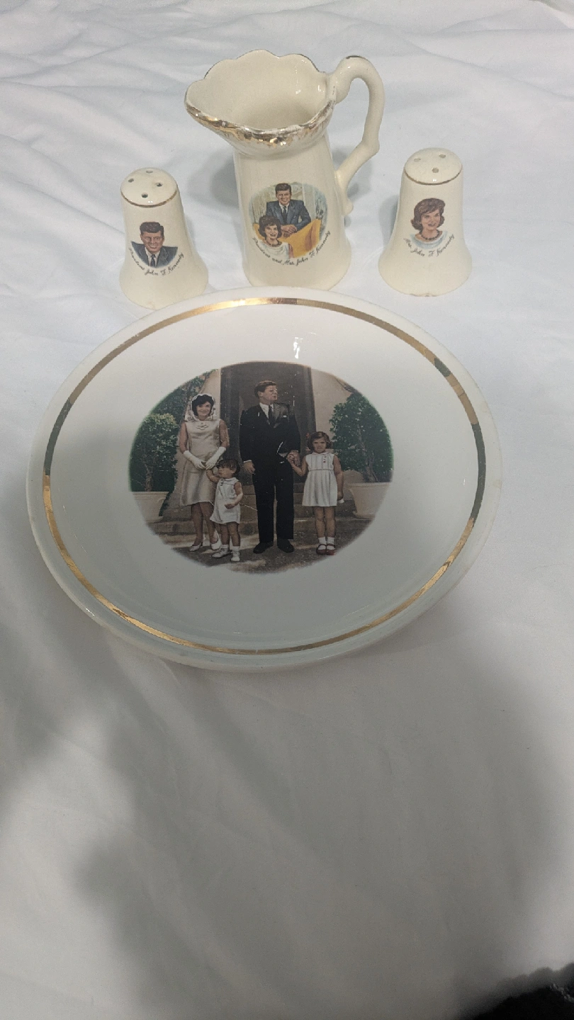 Selling set of vintage president and Mrs John F Kennedy kitchen items. Including a plate a pitcher and salt and pepper. there are some scratches on the plates paint which is shown in the photo and the JFK shaker is missing the cork and small chips on the bottoms of the Mrs Kennedy shaker. Open to best offer. Cash only. Pickup Donlands and Mortimer.