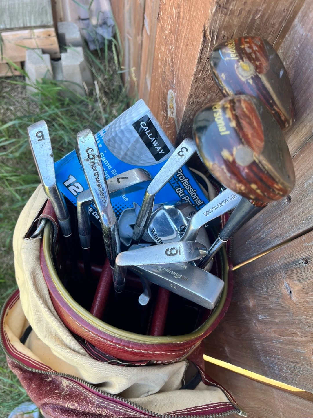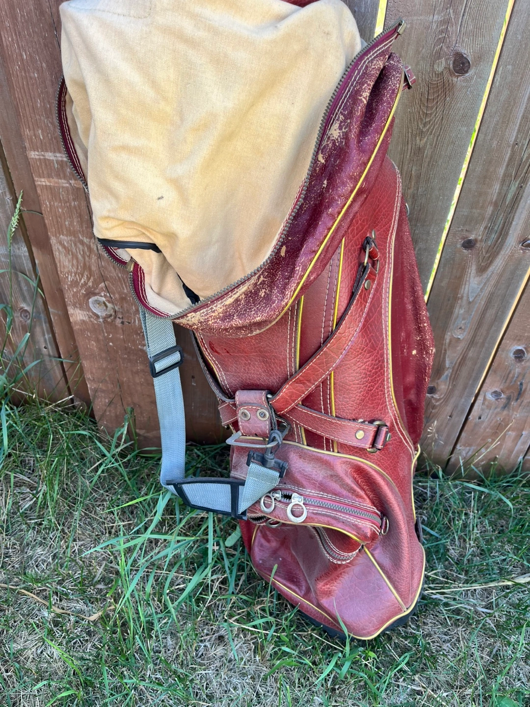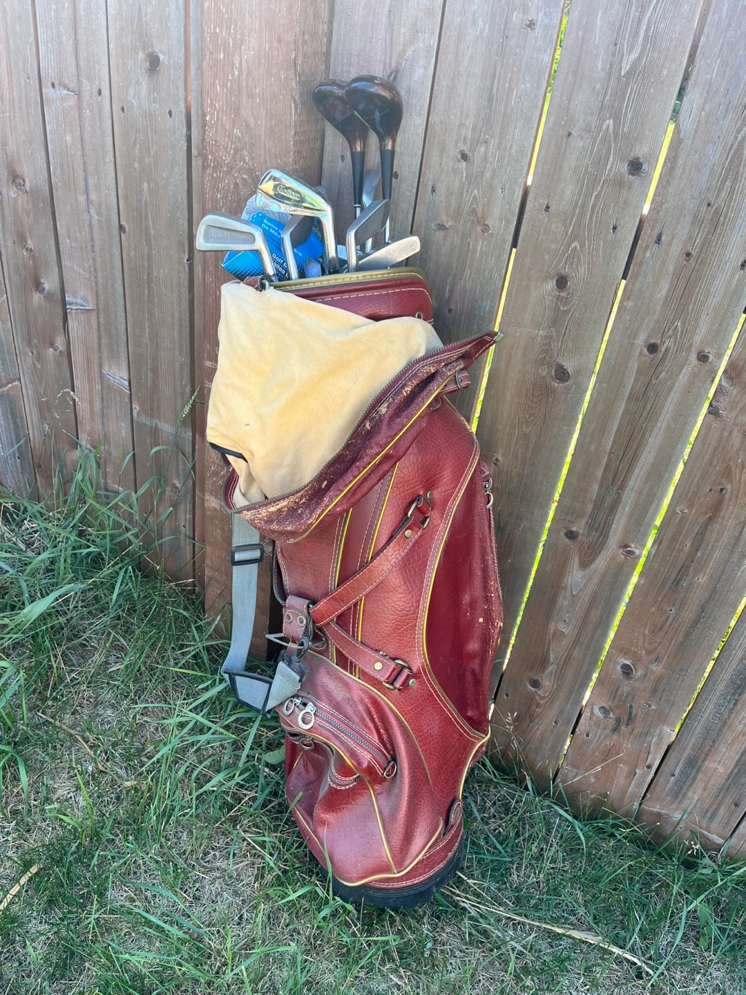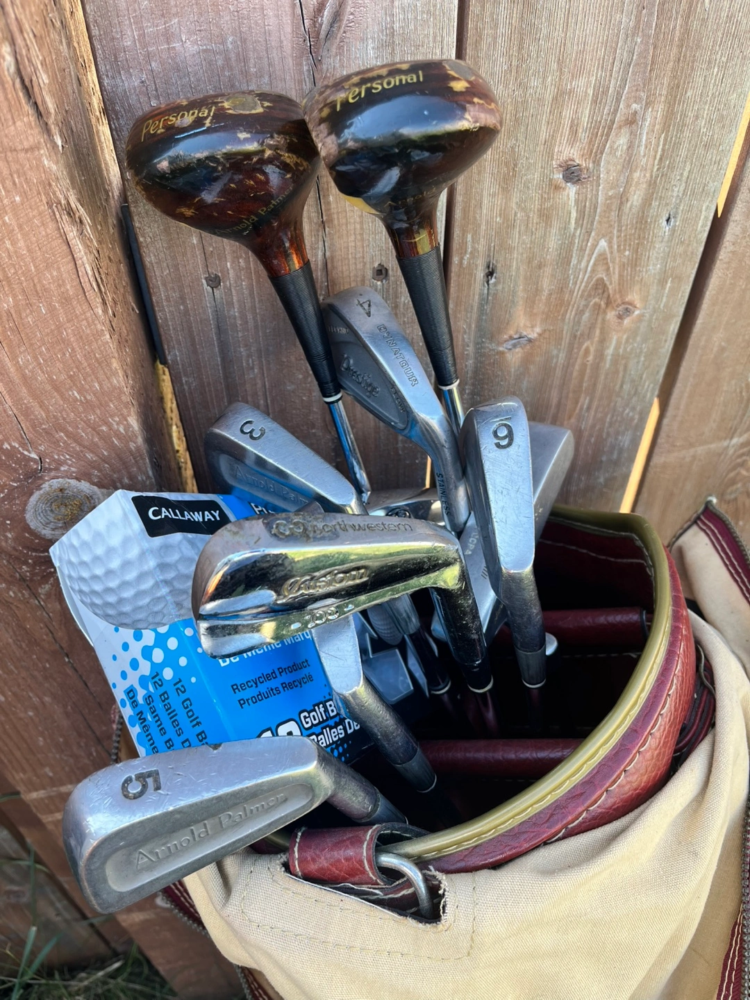 Selling a vintage leather golf bag that comes with a set of clubs! The bag shows some wear, but it still has a lot of character. Includes various clubs from brands like Northwestern, Arnold Palmer, and Callaway. Perfect for someone looking for a classic golf setup!