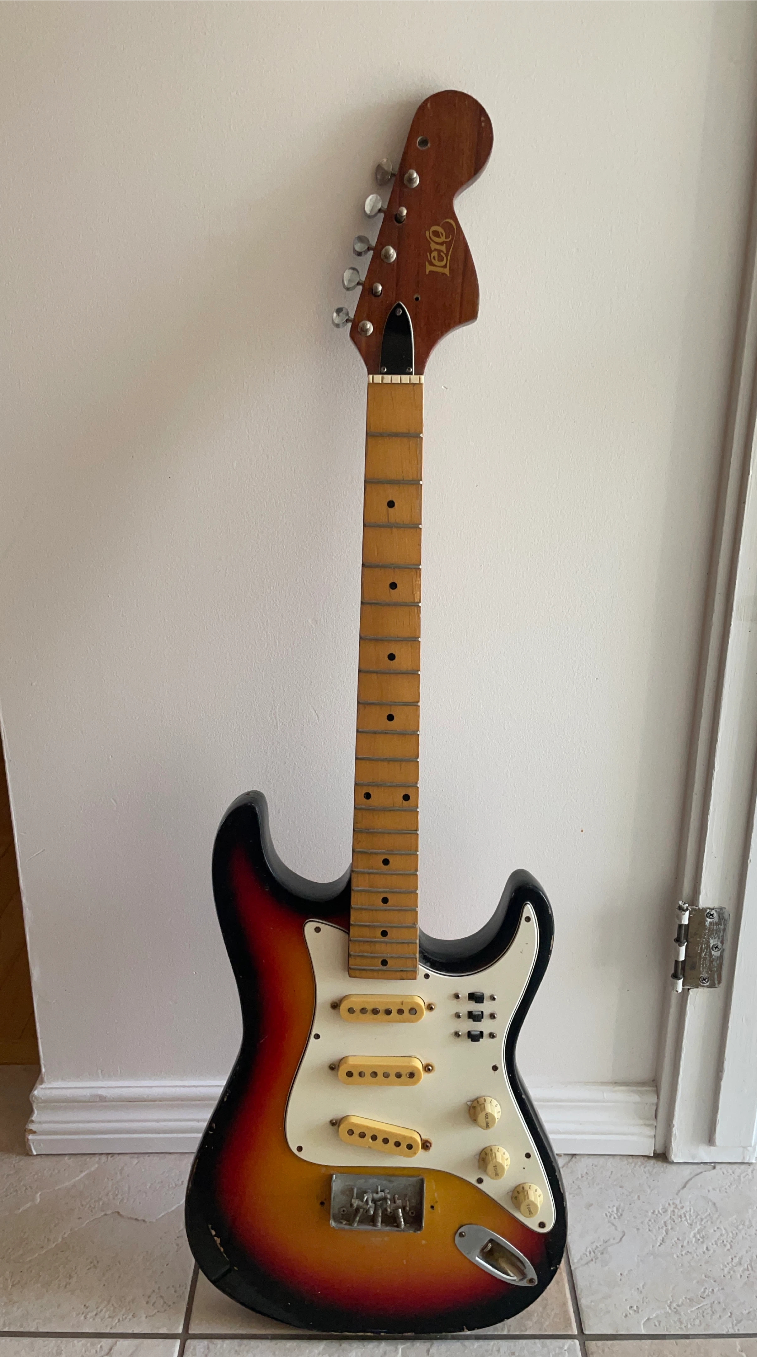 Selling a vintage Lero electric guitar. It has a sunburst finish and a maple neck. It shows some signs of wear, but it's still a great instrument for any guitarist looking for a classic sound