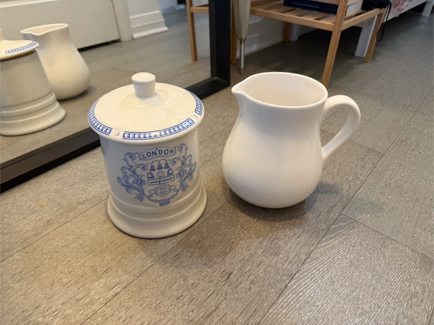 Selling a charming vintage set that includes a London Confiserie jar and a pitcher. The pitcher is made in Italy