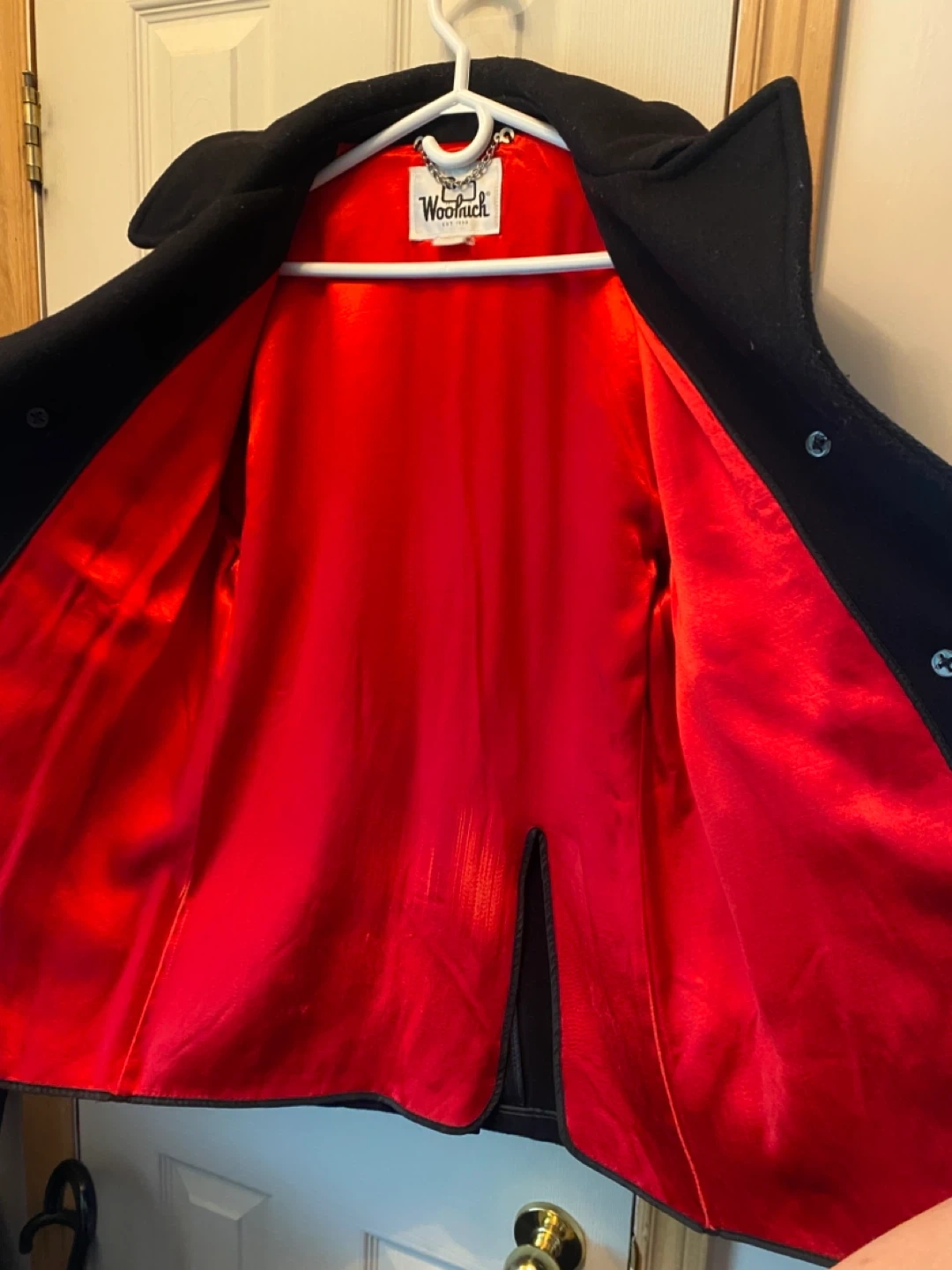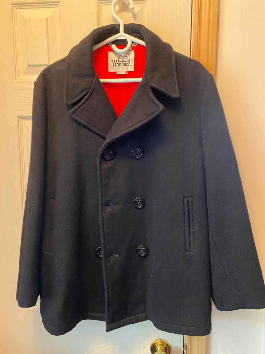 Woolrich, 80's Vintage Peacoat, men's size 40 (40" chest), the tag is worn but it's at least 15% Nylon, meaning this is a commercial version not the US Navy uniform issued version. So, 85% virgin and reprocessed wool. Size Medium. Good condition.