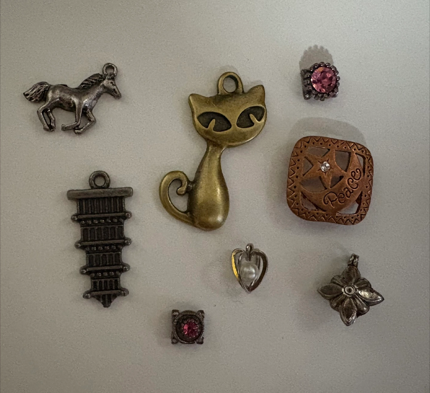 I'm selling a collection of metal charms! These are perfect for jewelry making, scrapbooking, or any other crafting project you have in mind. There's a variety of shapes and sizes, including a horse, cat, building, heart, bow, and a square charm with a peace sign. They're in great condition and ready to be used in your next creative endeavour