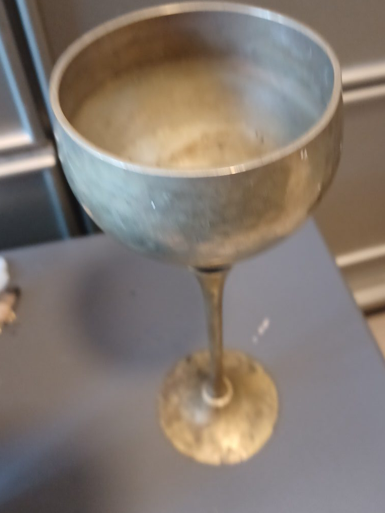 Selling a vintage metal goblet. It has a unique, aged look that would be great for decor or as a prop. It shows signs of use and wear, adding to its vintage charm
