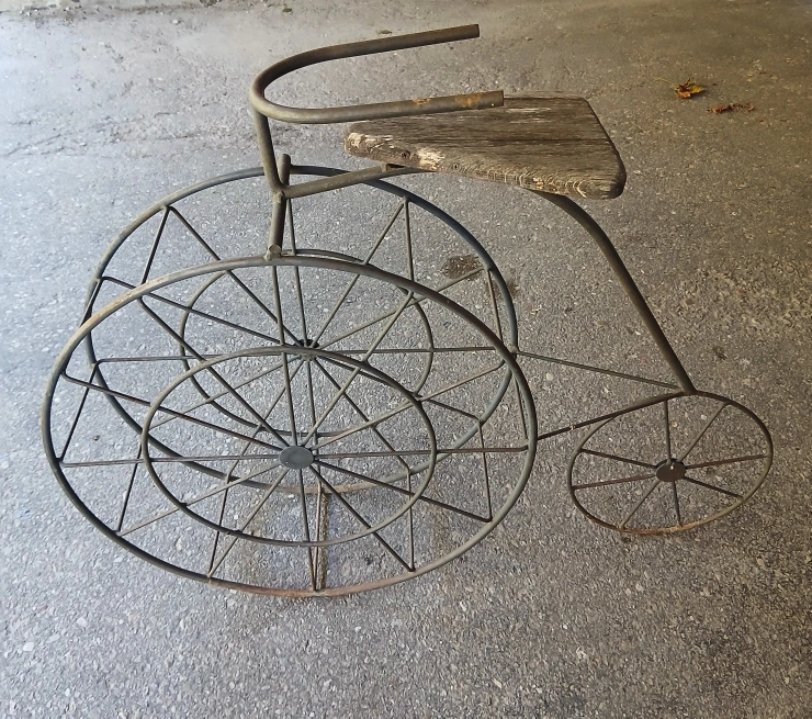 Selling a vintage metal tricycle planter. It has a rustic look with a wooden seat. Perfect for adding a unique touch to your garden or patio 26 inches tall by 34 inches