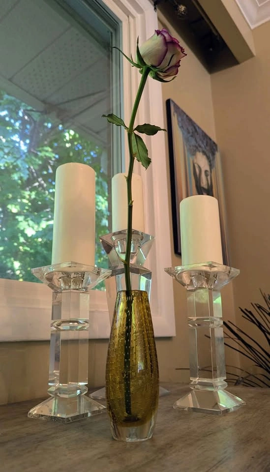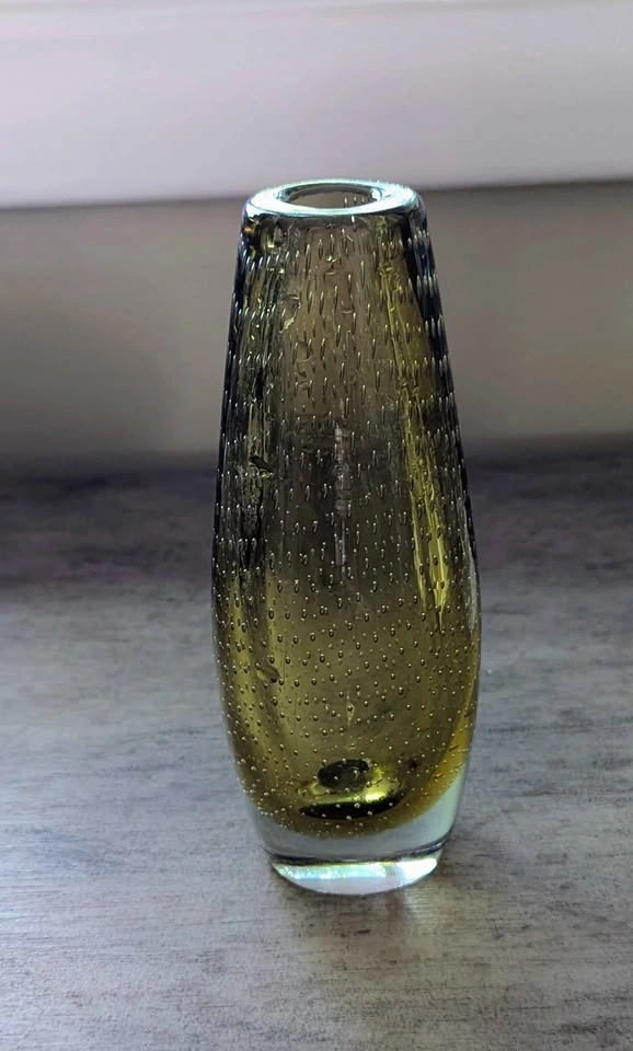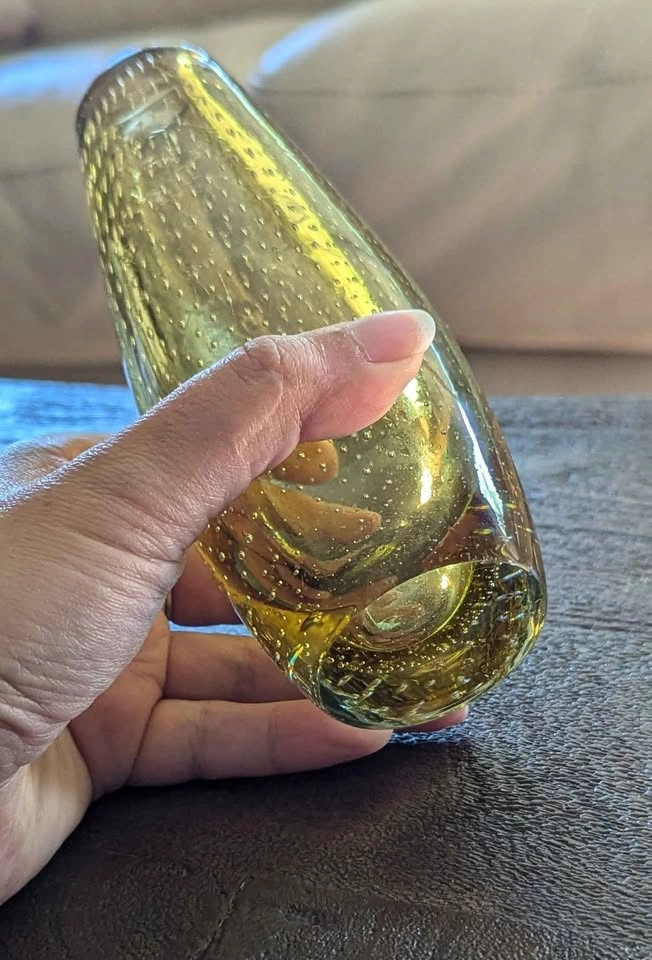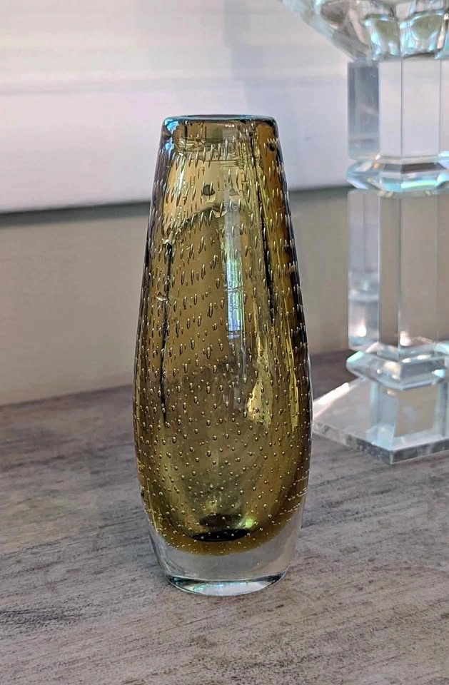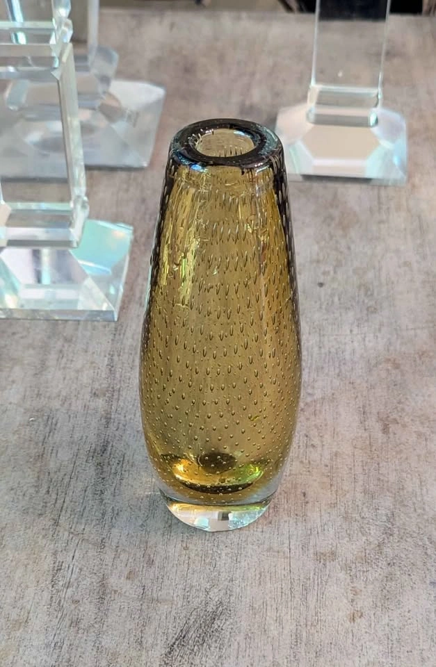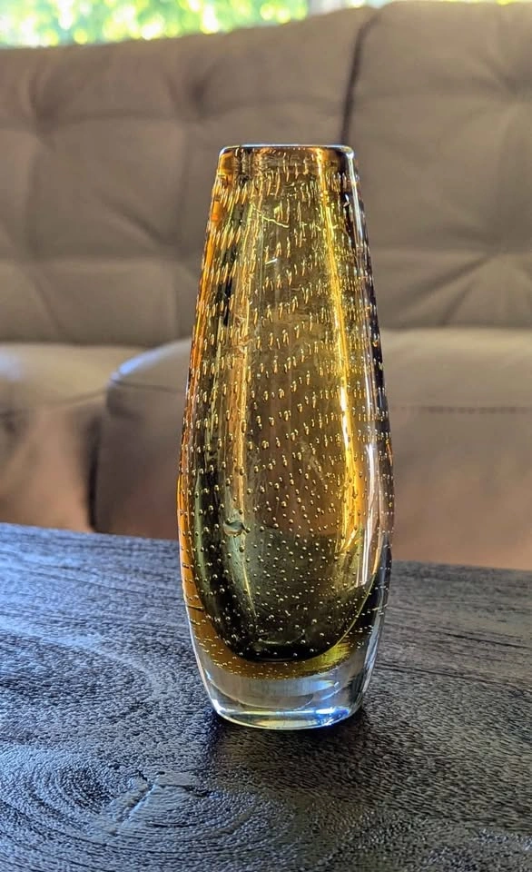 Beautiful heavy Murano-style art glass vase featuring the Bullicante technique (controlled bubbles) in a amber/honey tone with a clear glass base. Hand-blown with polished base, very solid and weighty for its size. Approx. 6.5 inch height Perfect as a collector’s piece, display vase, or gift for a vintage glass lover!