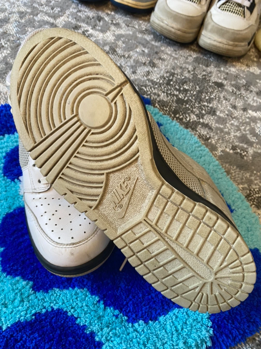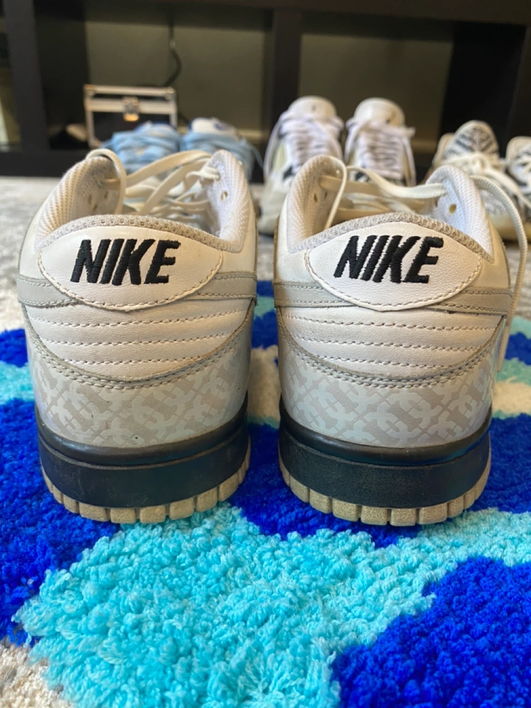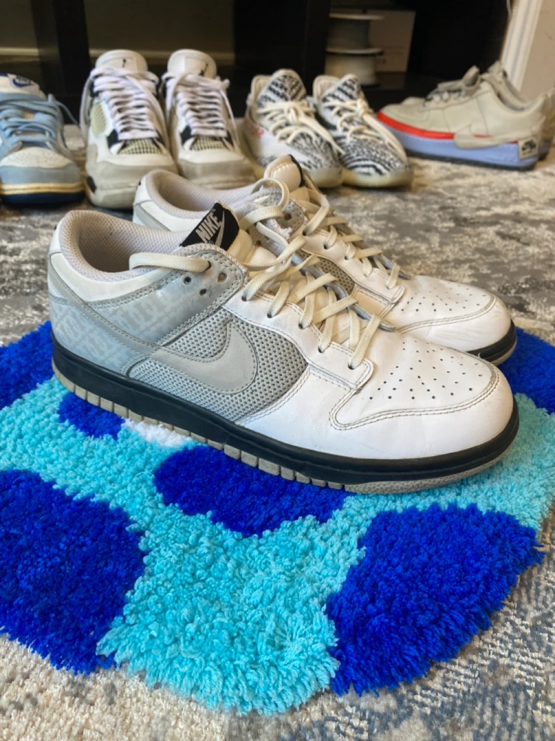 Selling a pair of Nike Dunk Lows in a white and grey colourway. They are a size 9 US. The shoes show some signs of wear, as seen in the pictures, but still have plenty of life left!