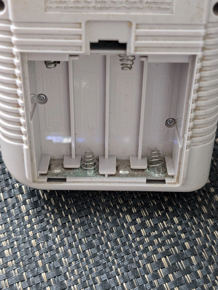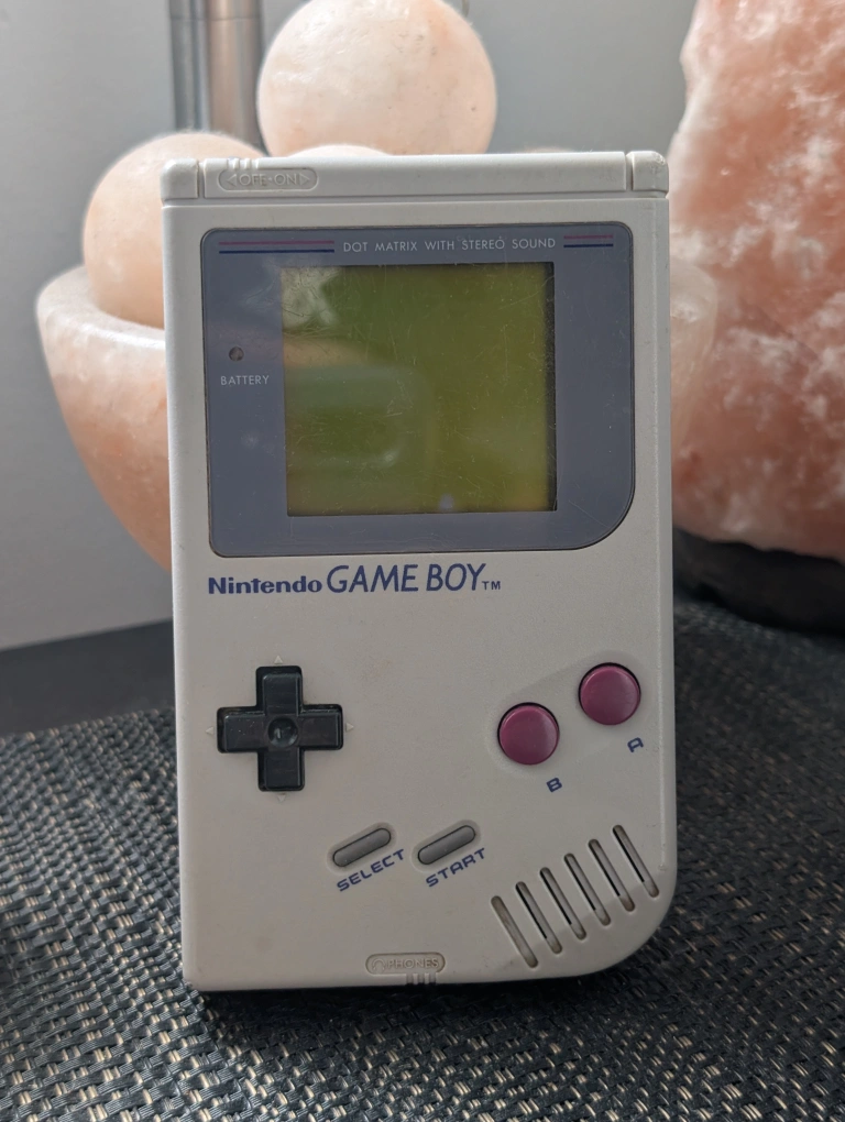 Original Game Boy handheld gaming console. Light grey colour. Shows signs of wear and tear. Battery compartment shows corrosion. Includes no games or accessories.
