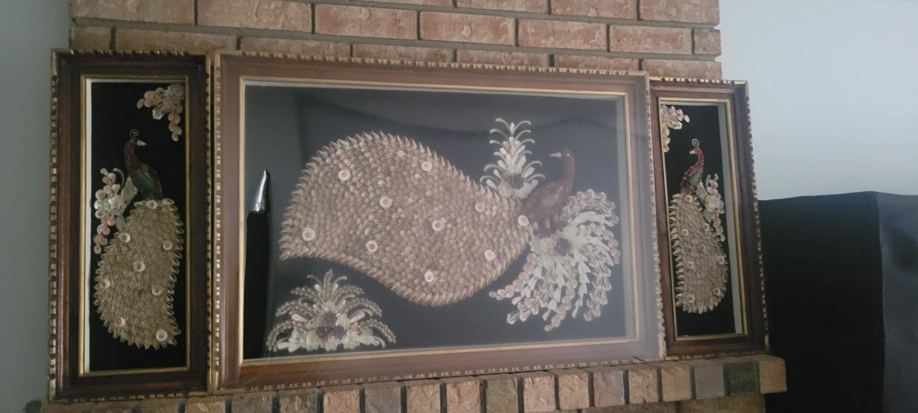 Selling a set of three vintage picture frames featuring peacock shell art. These unique pieces would add a touch of elegance to any room. The frames are in good condition and ready to be displayed in your home