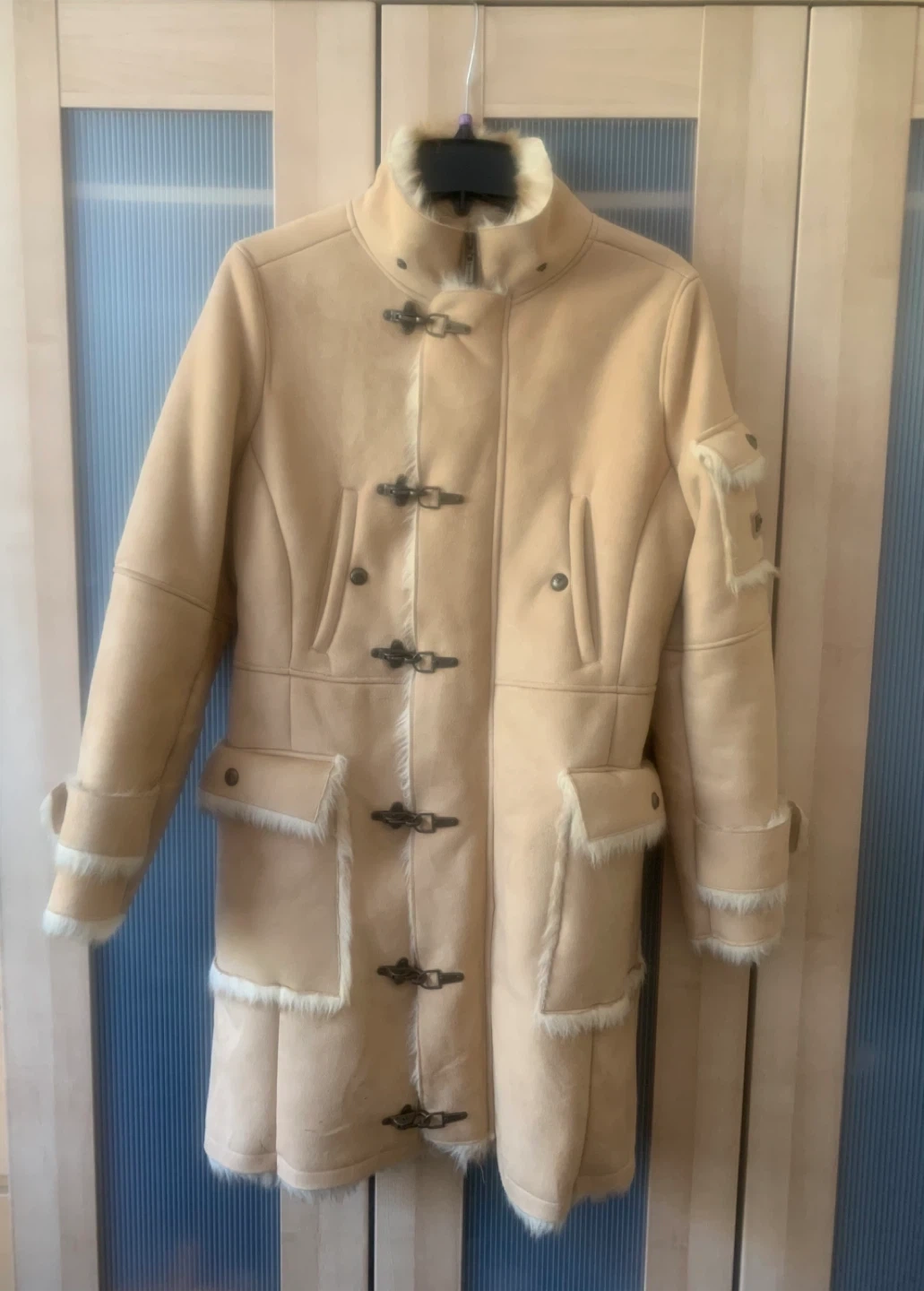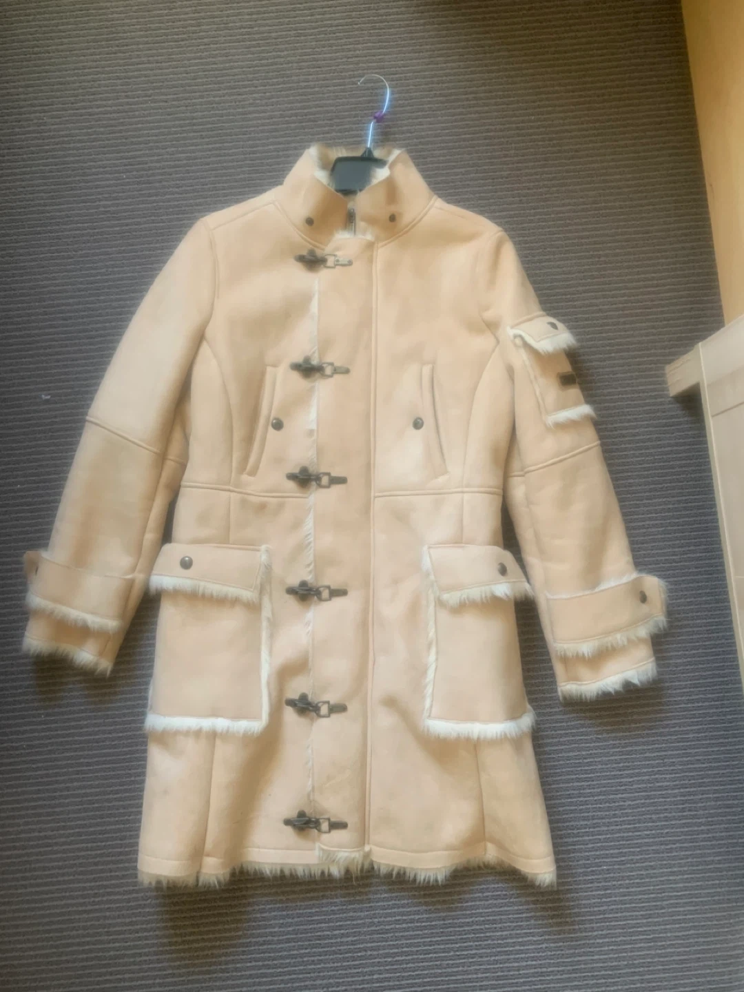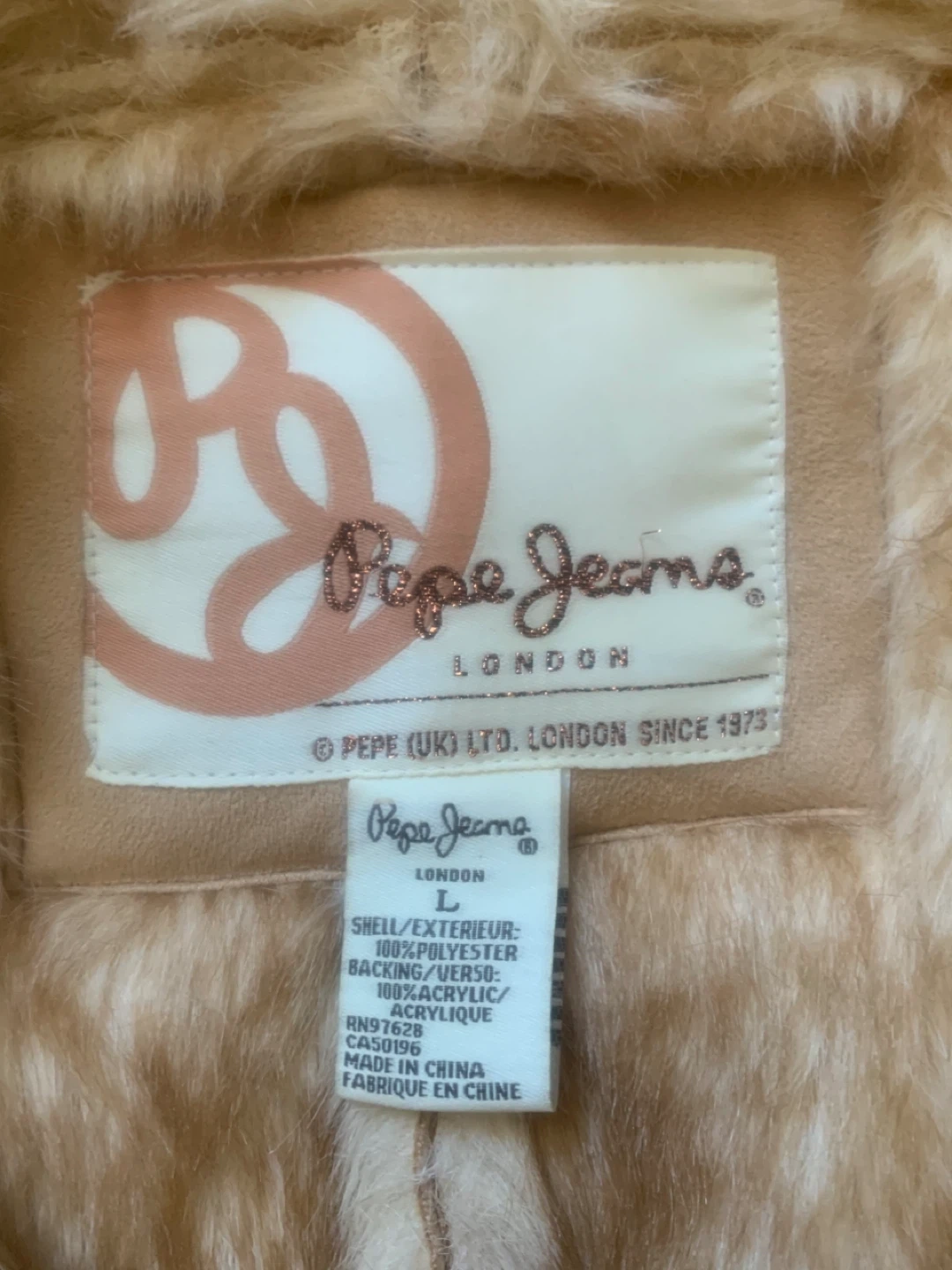 Cozy up in this stylish vintage Pepe Jeans London faux fur coat! It's a size L and features a soft, plush interior and unique buckle closures. The shell is 100% polyester, with acrylic backing. Perfect for adding a touch of warmth and style to your wardrobe. Pick up at Eglinton Ave east at Bayview.