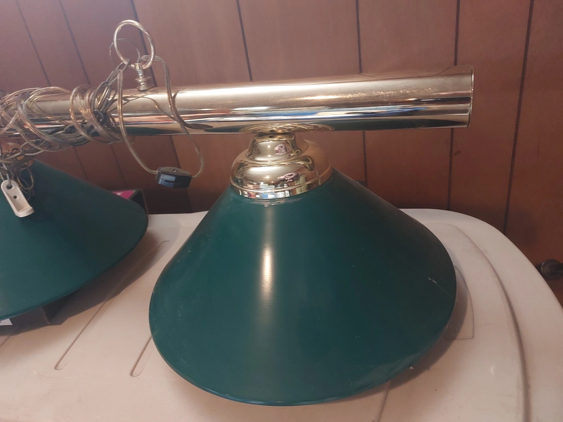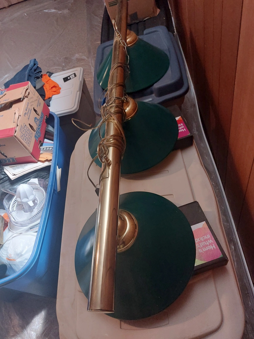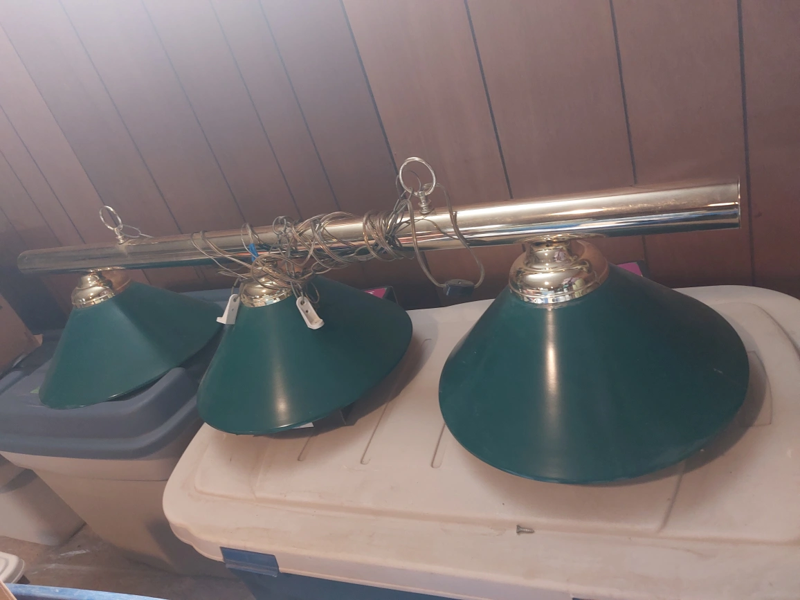 A pool table light fixture, with three green shades. A brass-tone finish, along with wiring. This would be great for adding some peaceful lighting to a game room.