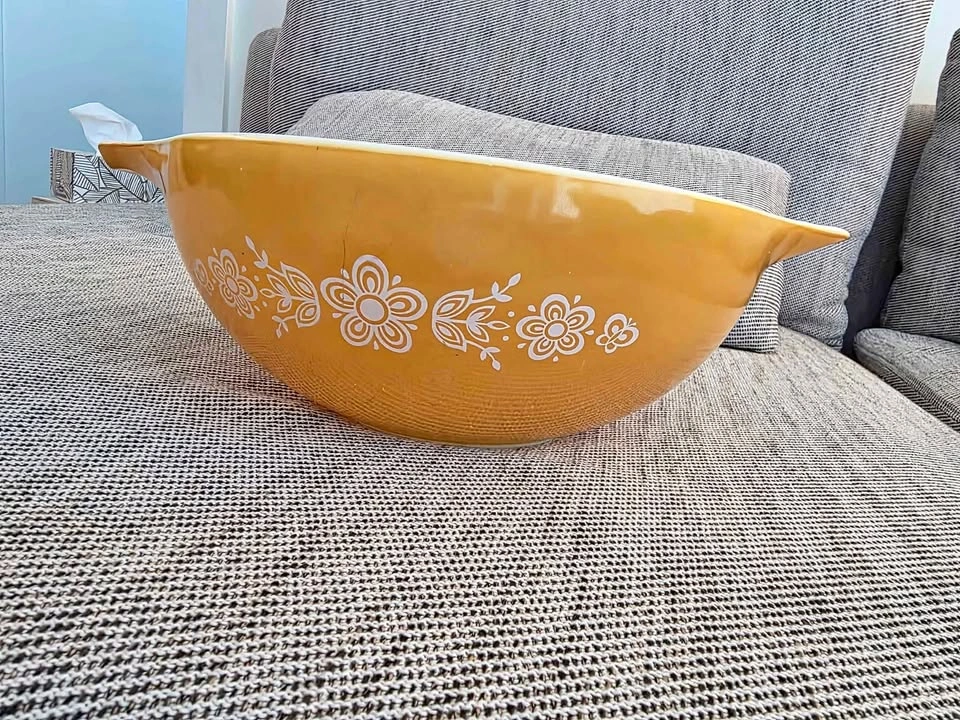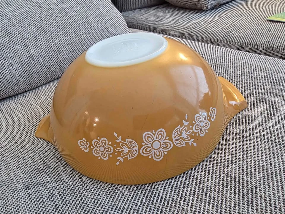 Pyrex Cinderella Mixing Bowl, size 444 (4-quart) in the beautiful Butterfly Gold pattern (produced in the 1970s). Classic Pyrex spout + handle design Fully stamped PYREX on bottom Color: gold (butterflies & five-petal flowers) on (white/golden) background — as shown in photos Perfect piece for collectors, display, or gentle use (hand-wash recommended to preserve finish)