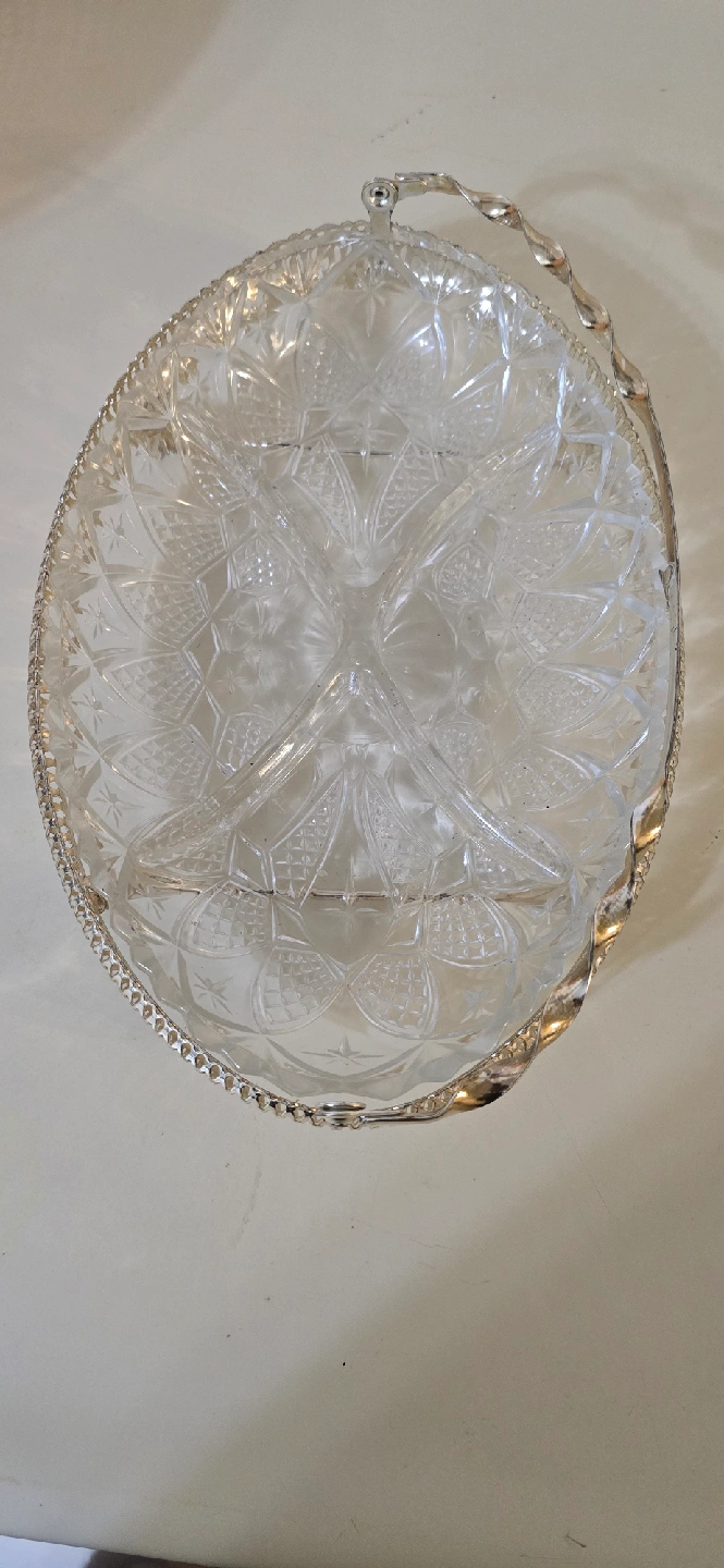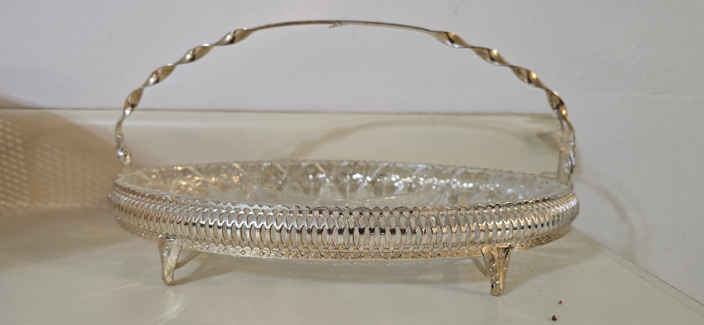 Selling a lovely vintage silver plated crystal basket. It's in great condition and would look beautiful as a centrepiece or for serving goodies. The intricate detailing on the silver plating adds a touch of elegance to any table setting