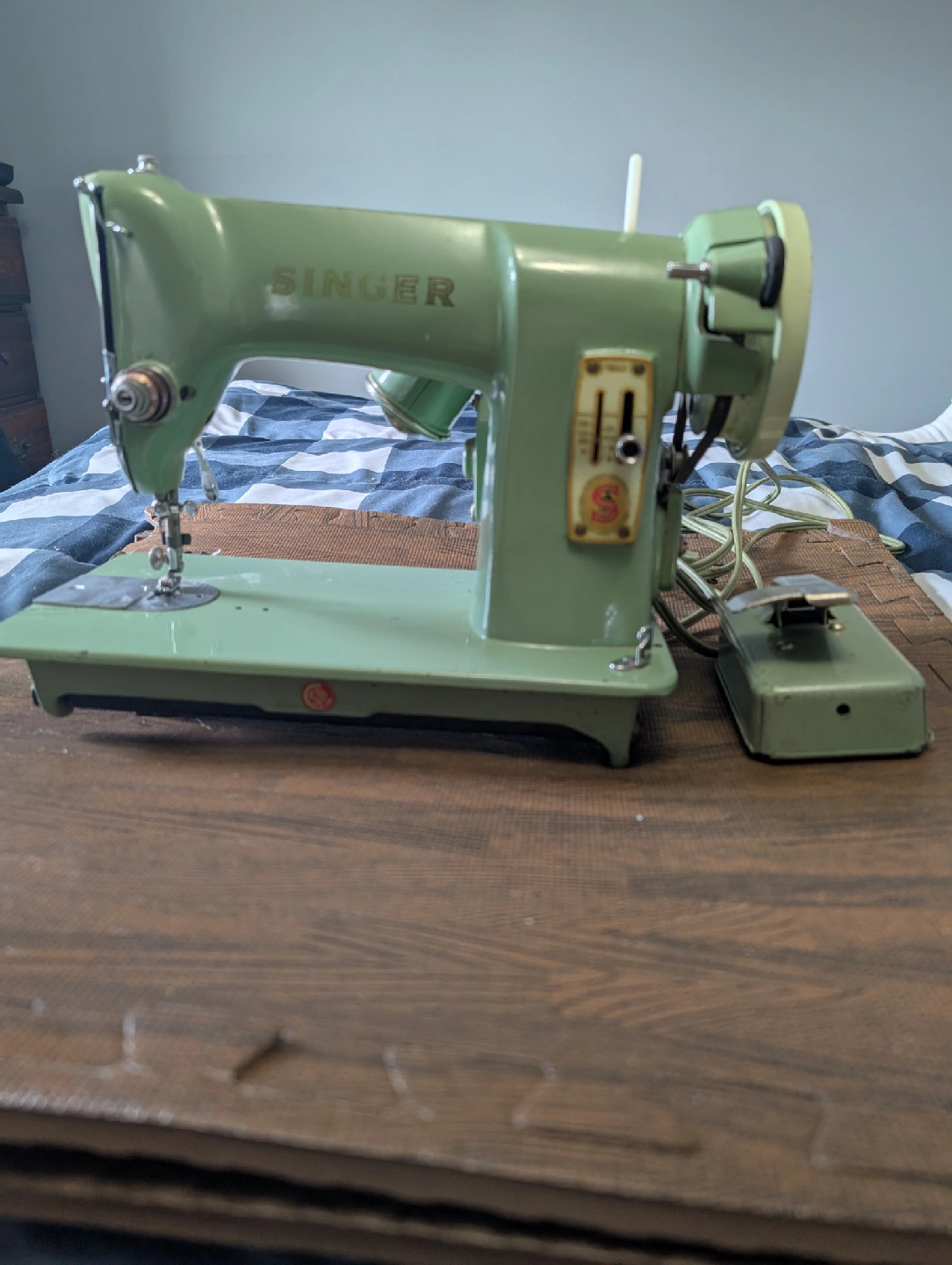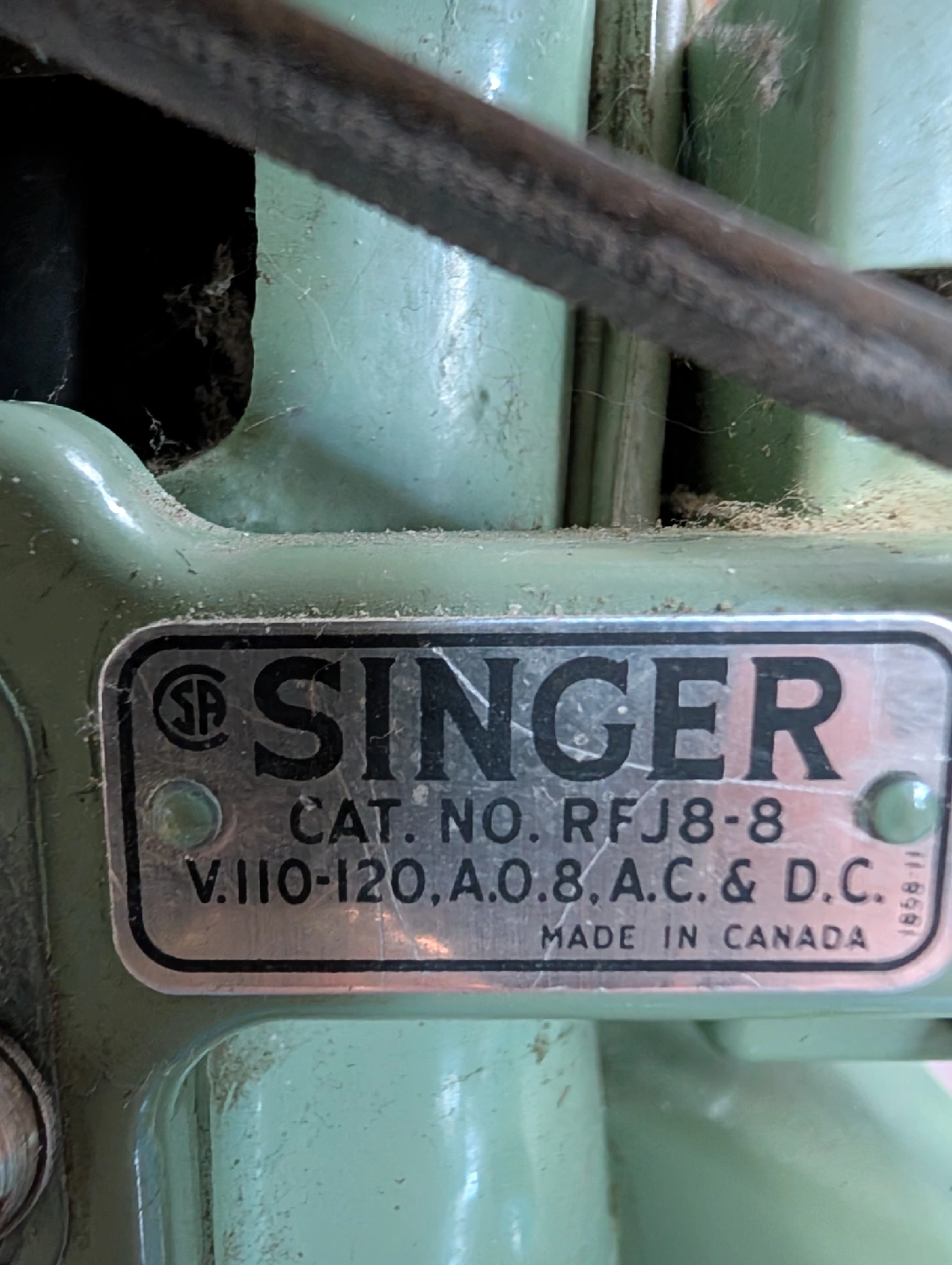 Selling a vintage Singer sewing machine in a lovely green colour! It's a classic piece, perfect for sewing enthusiasts or as a decorative item. The model number is RFJ8-8, and it was made in Canada. It uses 110-120 Volts, A.O.8, A.C. & D.C. It's in good condition for its age, with some signs of wear. A great find for collectors or anyone looking for a reliable vintage sewing machine