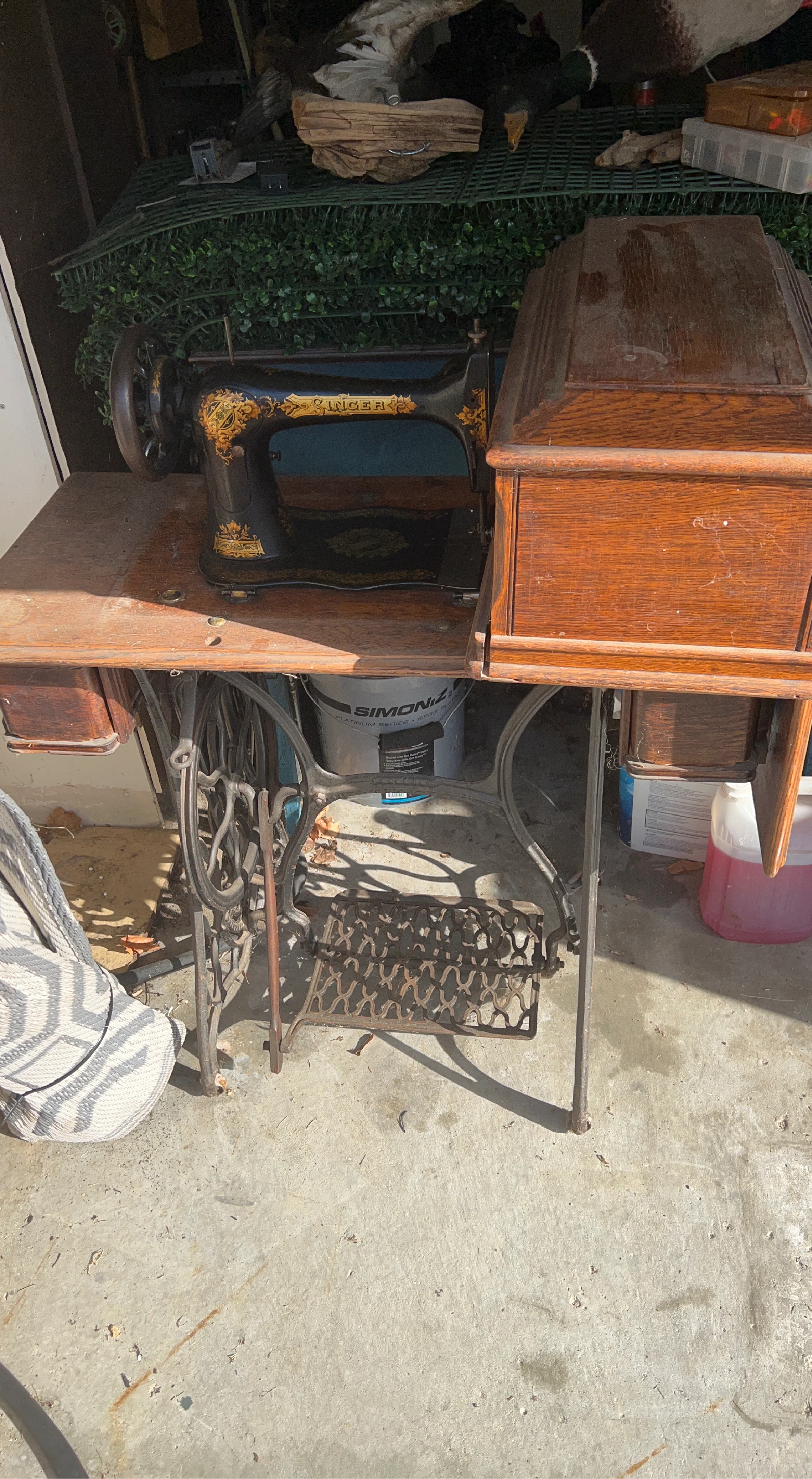 Selling a vintage Singer sewing machine with its original cabinet. It shows signs of wear consistent with its age, but it's a beautiful piece of history! The machine itself has ornate gold detailing. The cabinet is made of wood and has a fold-out design. Great for collectors or anyone interested in antique sewing machines