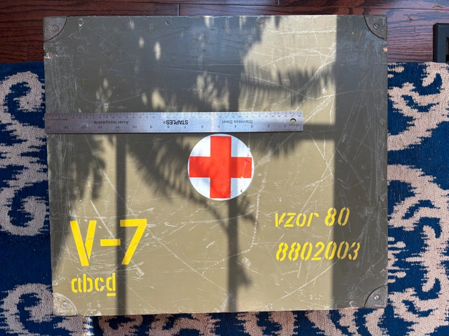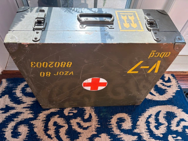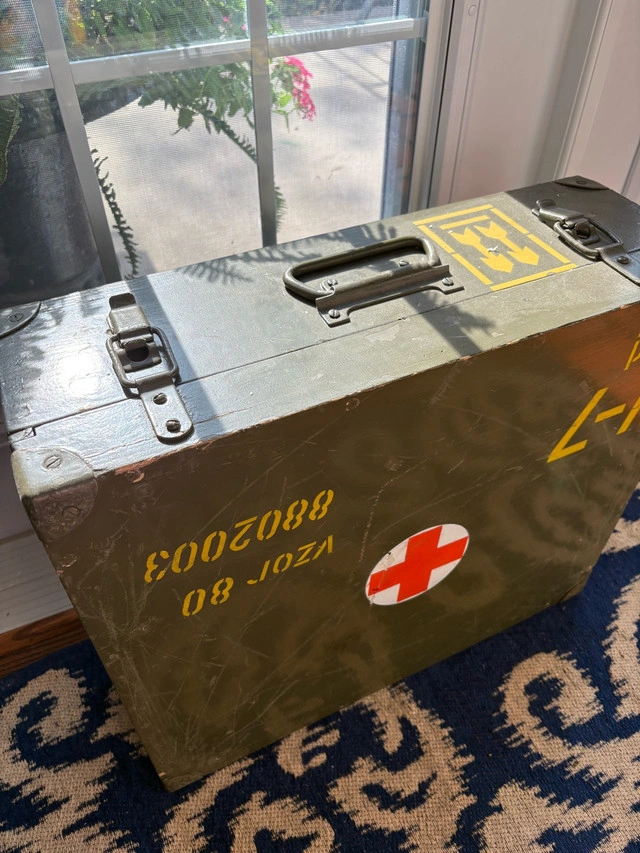 Add a one-of-a-kind conversation piece to your Thanksgiving gathering with this vintage medical trunk — a unique mix of history and style to impress your guests. Perfect for collectors, vintage décor enthusiasts, or prop designers looking for something truly special. Product Details: 🔹 Origin: Slovakia (European vintage medical equipment) 🔹 Markings on Lid: “vzor 80” + red cross emblem + serial no. 8802003 🔹 Inside Lid: Original Slovakian instructions for artificial respiration 🔹 Measurements: 57.5 cm (L) x 45 cm (W) x 18 cm (H) 🔹 Condition: Vintage wear consistent with age, adding to its character and authenticity ⭐ Why You’ll Love It: This isn’t just a medical box — it’s a conversation piece and a historical collectible. Ideal for vintage décor, medical history collectors, film props, or anyone who appreciates rare, authentic European finds. 💲 Price: $130 (Priced for rarity and collectible value) 📍 Pickup in Thornhill | 🚚 Local Delivery Available