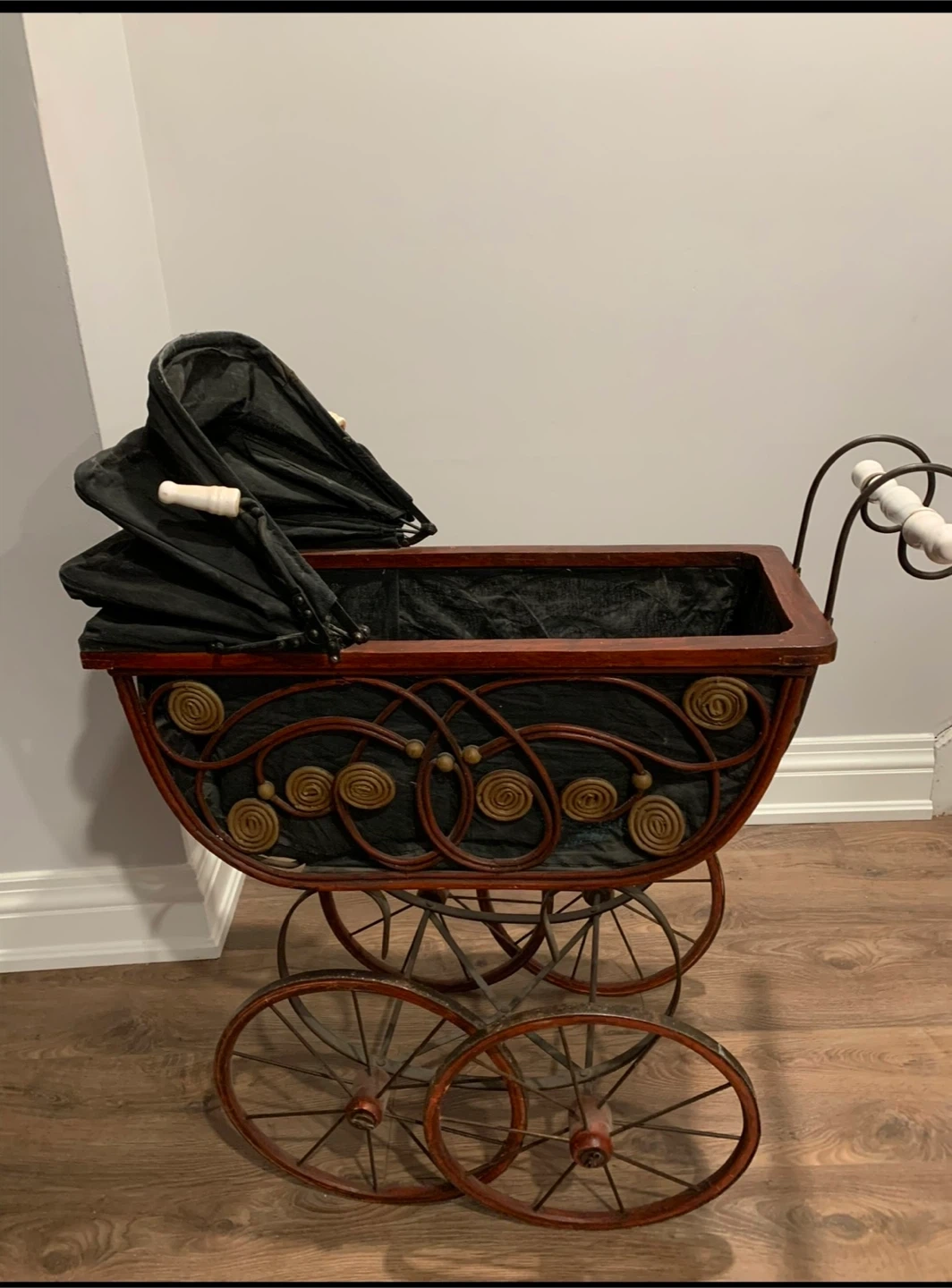 Selling a vintage-style baby carriage. It has a unique design with metal wheels and a wooden frame. The carriage is black and red with gold accents. Perfect for collectors or as a decorative piece!