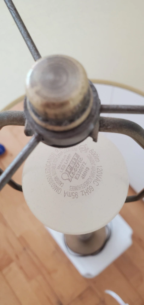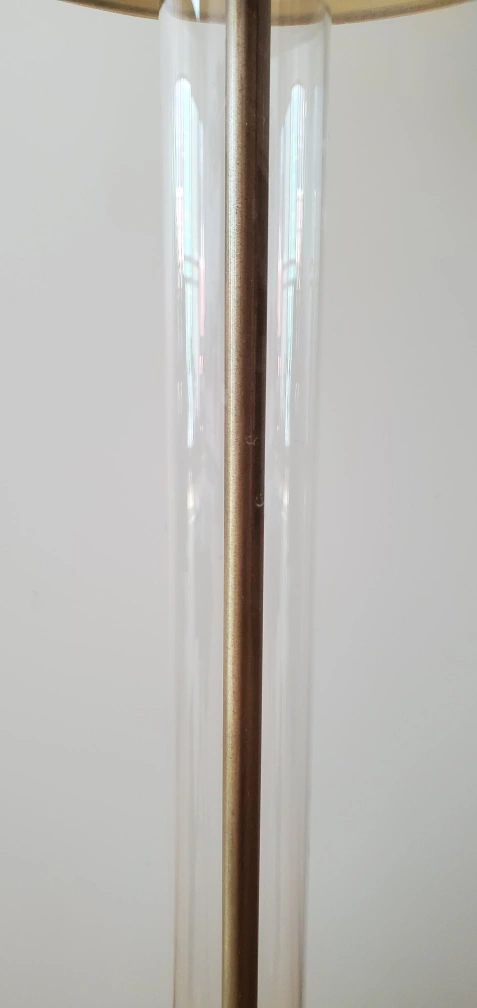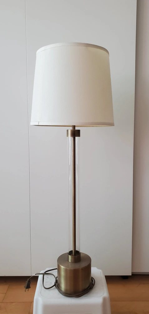 Table lamp with a lampshade. It has a gold base and a clear tube. The lamp shade is beige. This lamp is perfect for a cozy corner and reading a good book. Great for a shorter side table. 34.5" tall lampshade has a 10" diameter